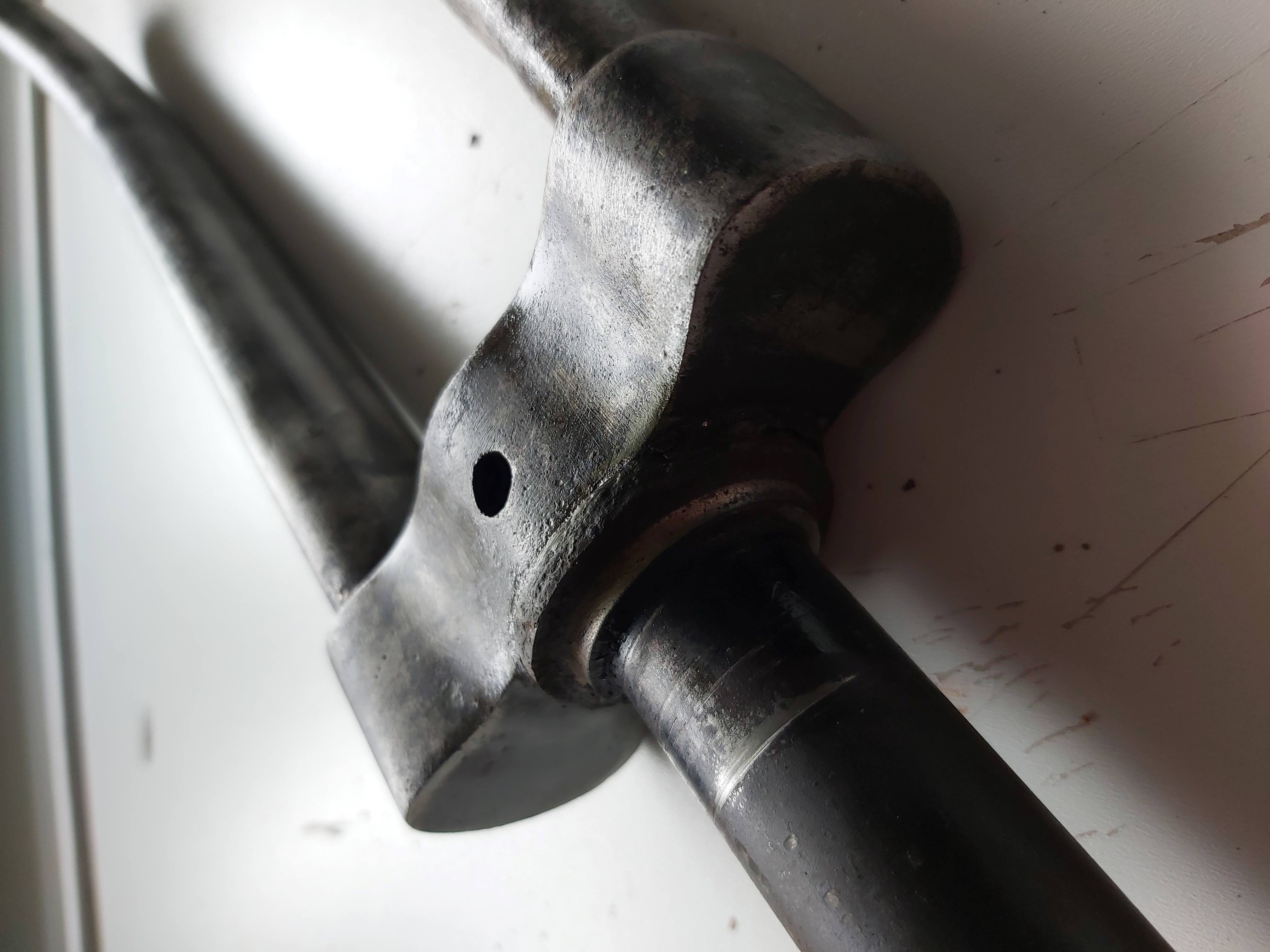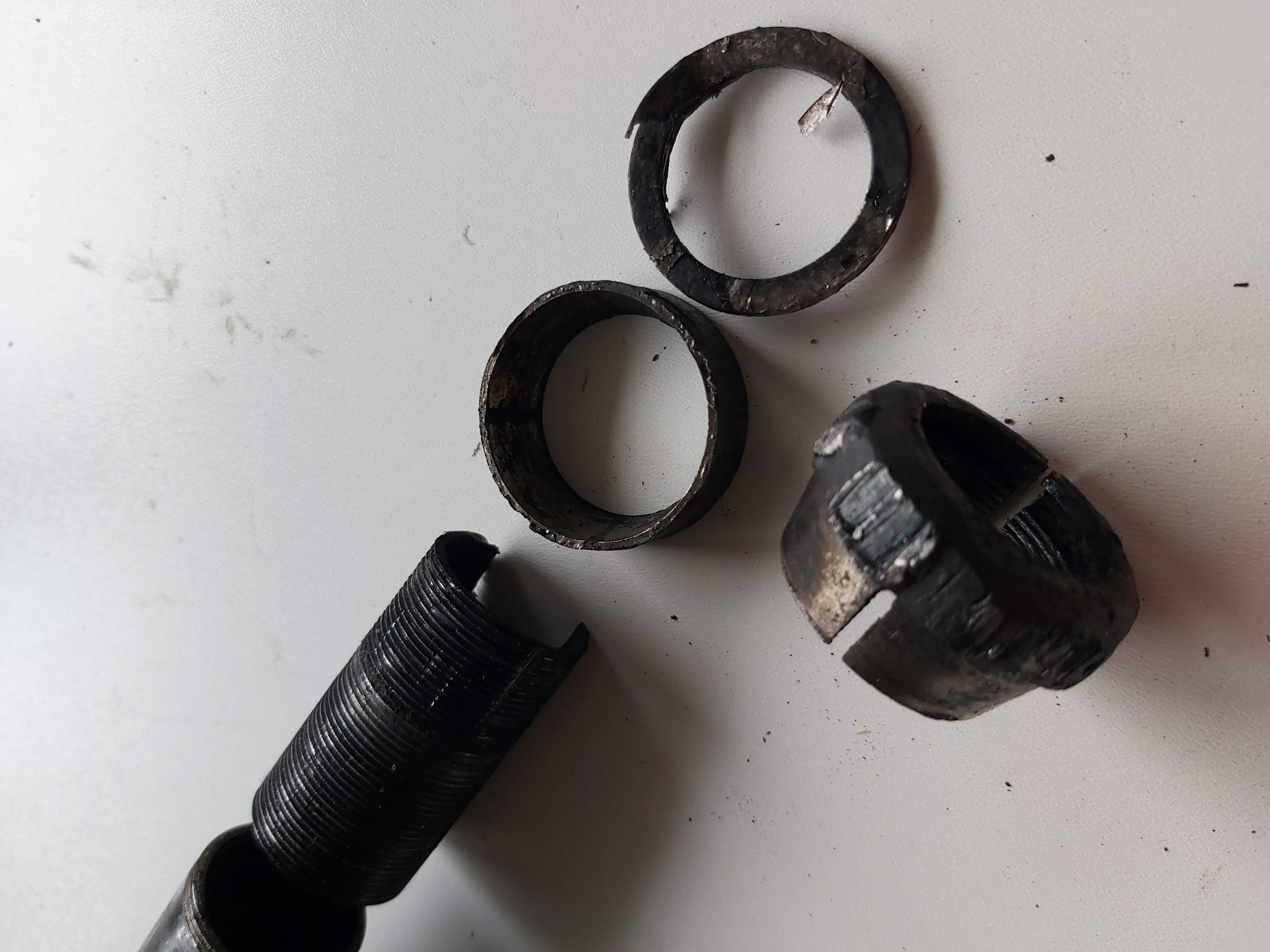 Hier even een update van het gevecht om de transportfiets van Phoenix uit 1954 te demonteren. Mijn collega en ik hebben de tips opgevolgd om het stuur eruit te krijgen. Dit bleek allemaal maar steeds niet te lukken. Het was een drama. Uiteindelijk is het vandaag gelukt in een werkplaats van een vriend, maar dat is helaas wel ten koste gegaan van de voorvork (zie foto's), tot mijn grote verdriet. Ineens hoorden we een knal en toen bleek de voorvork bij het schroefdraad recht afgebroken te zijn. De daarboven aanwezige onderdelen (moer conisch en ringen) hebben we ook door moeten slijpen om het stuur nog vrij te krijgen. Het zat allemaal echt ongelooflijk vast.