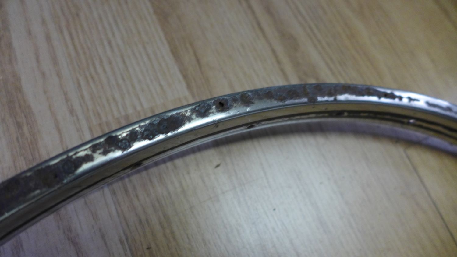 Ik had ook een Dunlop velg gekocht in Engeland via Ebay. Dit om de voorvelg te vervangen die erg roestig is. Maar ik ben genept met die velg omdat de zijkant doorgeremd en geroest is. Dat was op de foto`s niet te zien.