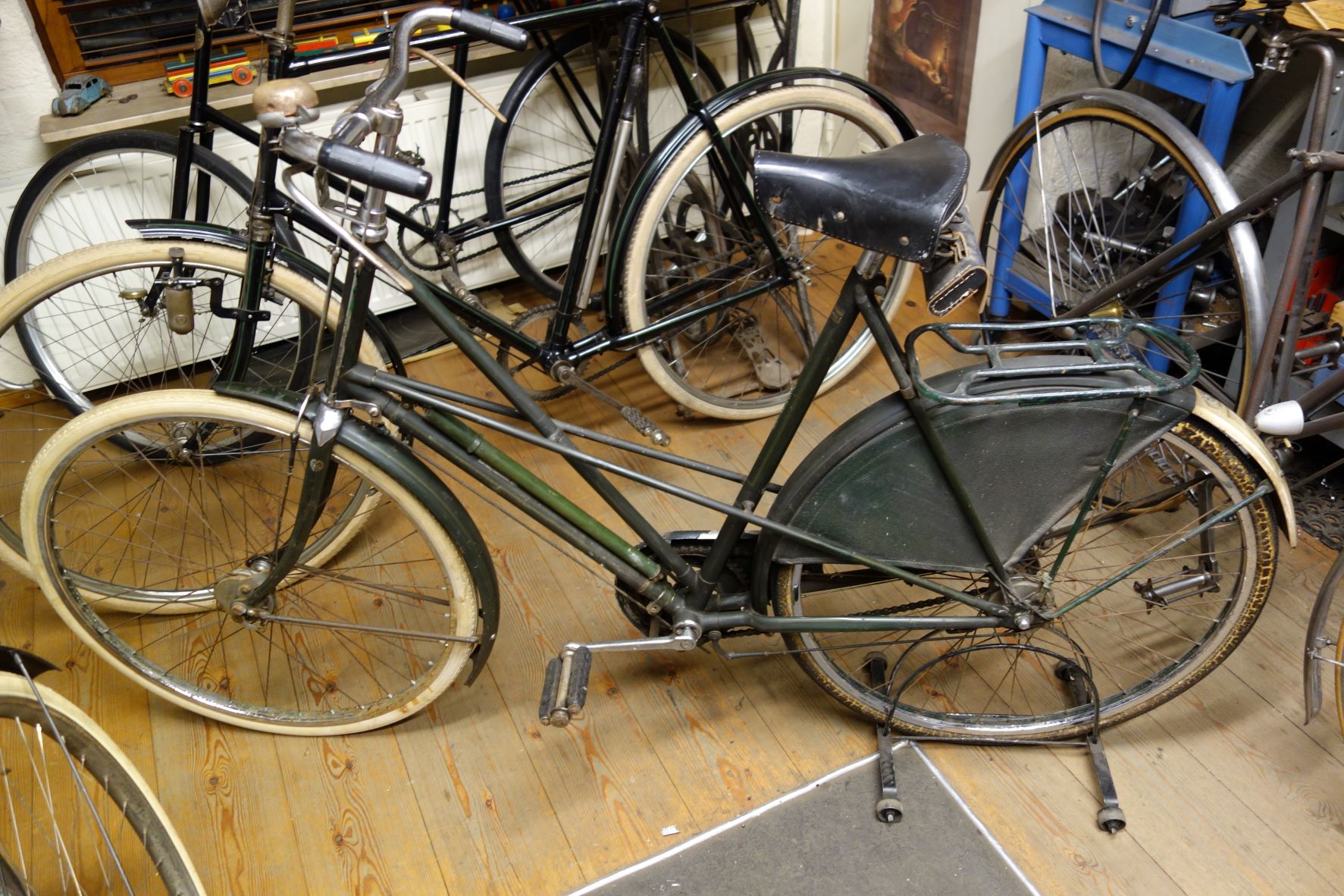 De Locomotief super de luxe uit 1939 is een beetje verder. Ik heb in de UK een mooi klein Terry zadeltje gevonden en er zit een belastingplaatje om het stuur. Ik had ook een Dunlop velg gekocht in Engeland via Ebay. Dit om de voorvelg te vervangen die erg roestig is. Maar ik ben genept met die velg omdat de zijkant doorgeremd en geroest is. Dat was op de foto`s niet te zien. Ik twijfel nog om `m toch te monteren omdat de bovenkant erg netjes is.