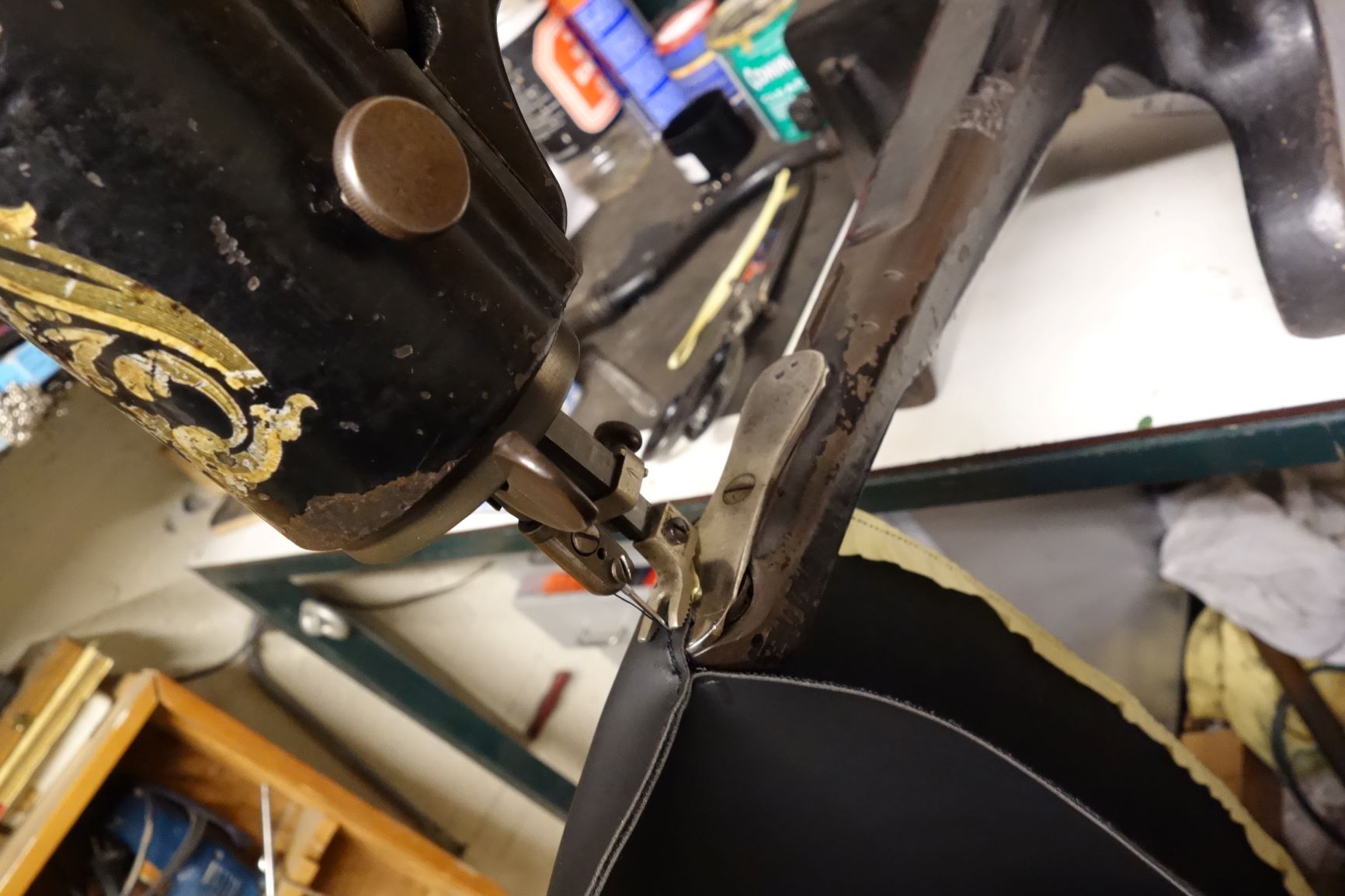 Op een oude Singer leer naaimachine heb ik de voor en achterkant gestikt.