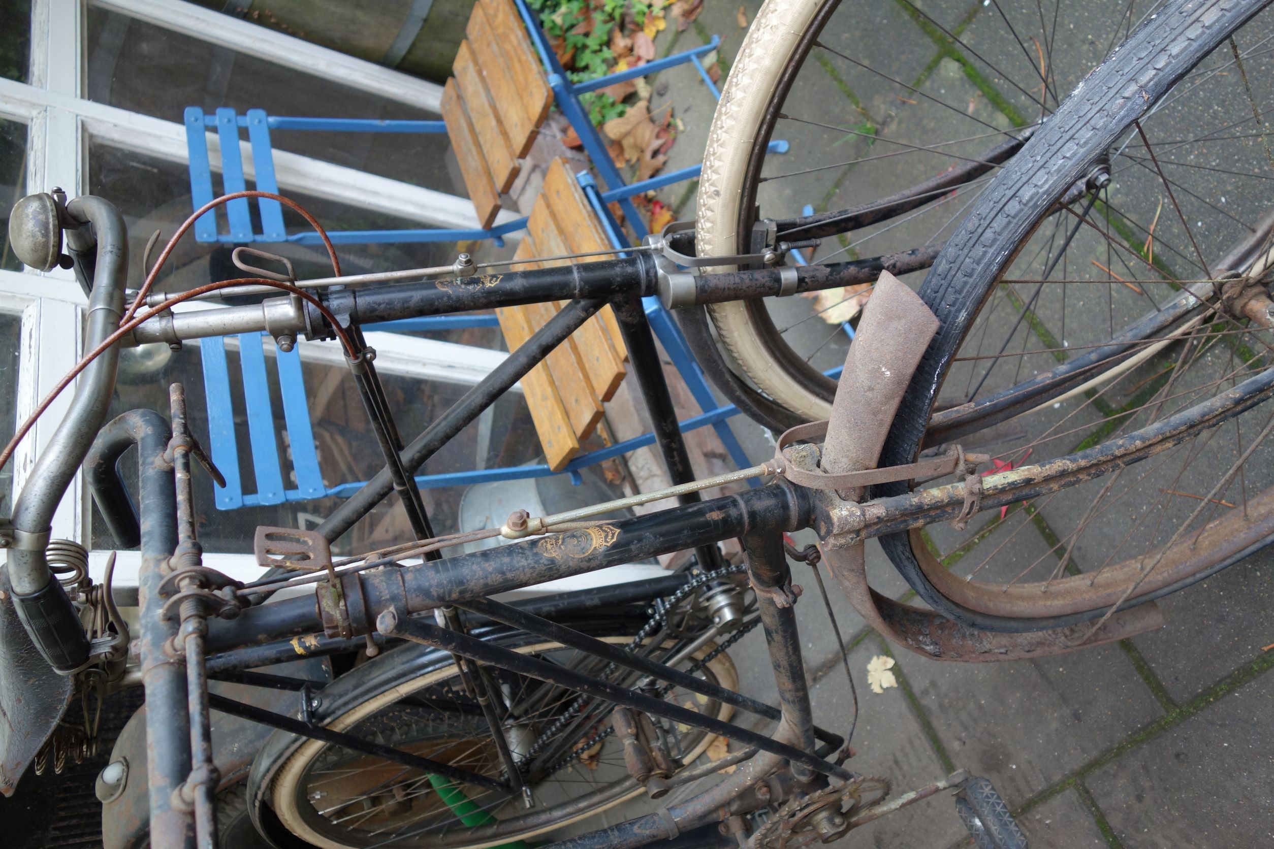 Een model Populair die totaal onder de smeer zit. Er onder geen blinkend nikkel trouwens maar wel een aardig uiterlijk met staal,roest en hier en daar lak en een bies. Ik had de fiets gekocht met het idee om de dameskruisframe wat origineler te kunnen maken.