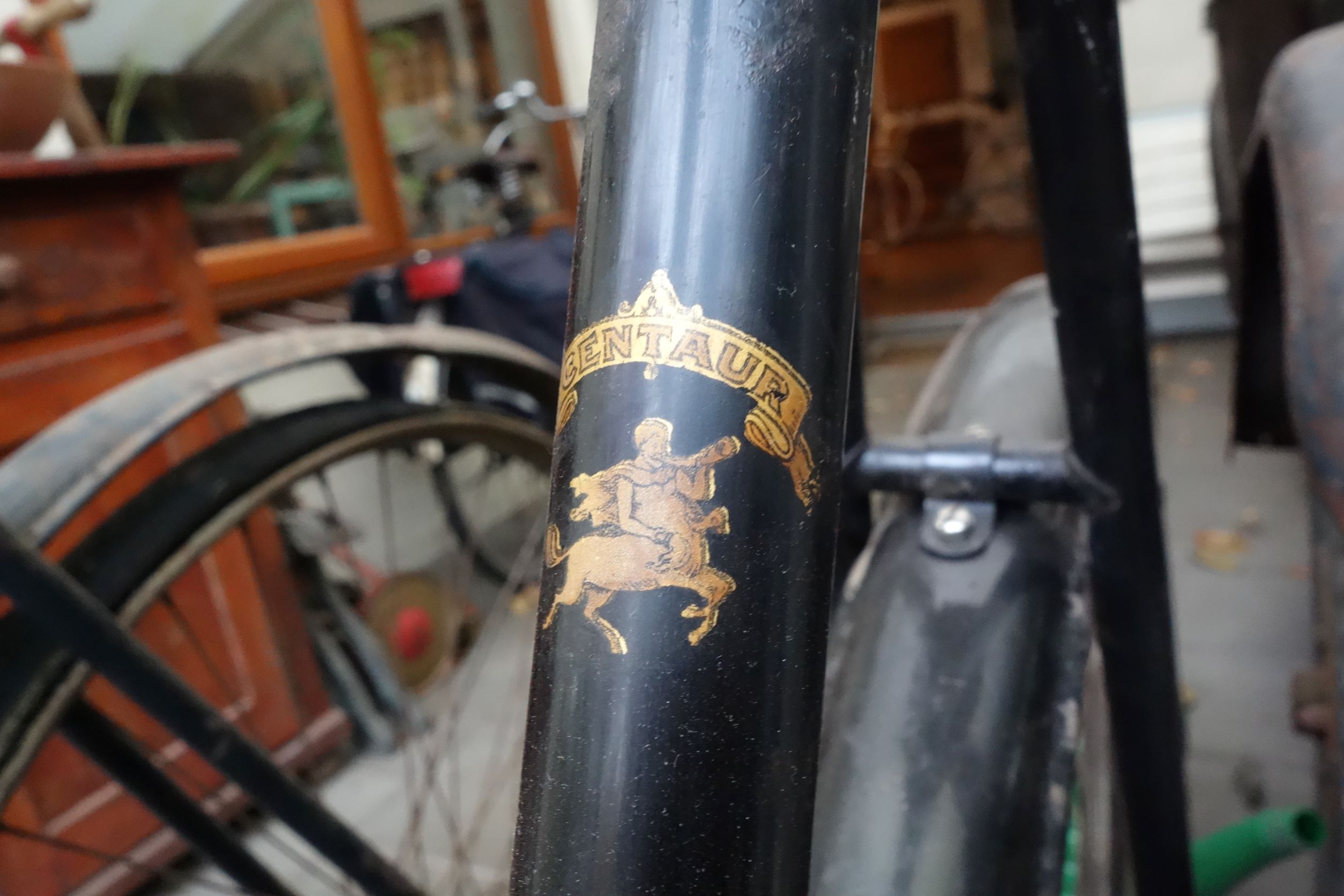 Ik heb de herenfiets er nog eens naast gezet .Veel overeenkomsten natuurlijk maar ook een aantal wijzigingen die in de loop der jaren zijn doorgevoerd. De damesfiets heeft bijvoorbeeld al een expander bout in plaats van een stuur strop en de staande achtervorken zijn bovenaan niet meer gesoldeerd maar hebben een platte verbinding naar zadelbout. De remmen van de damesfiets kunnen wel met stangen aan het stuur te zijn geweest maar bij het voorwiel behoren ze identiek te zijn aan die van de herenfiets. Dat is duidelijk (nog) niet het geval. Beide fietsen zijn eens gerefurbished en de Centaur transfers zijn ook anders dan bij de originele lak.