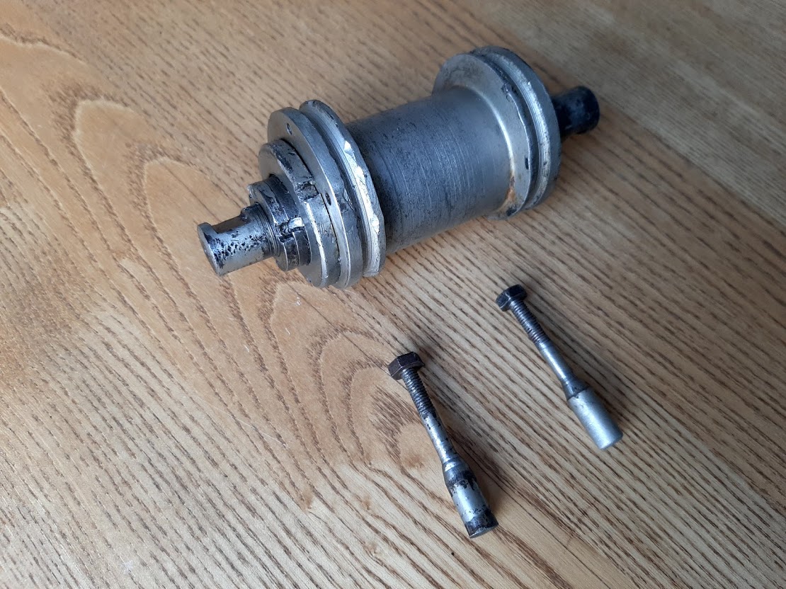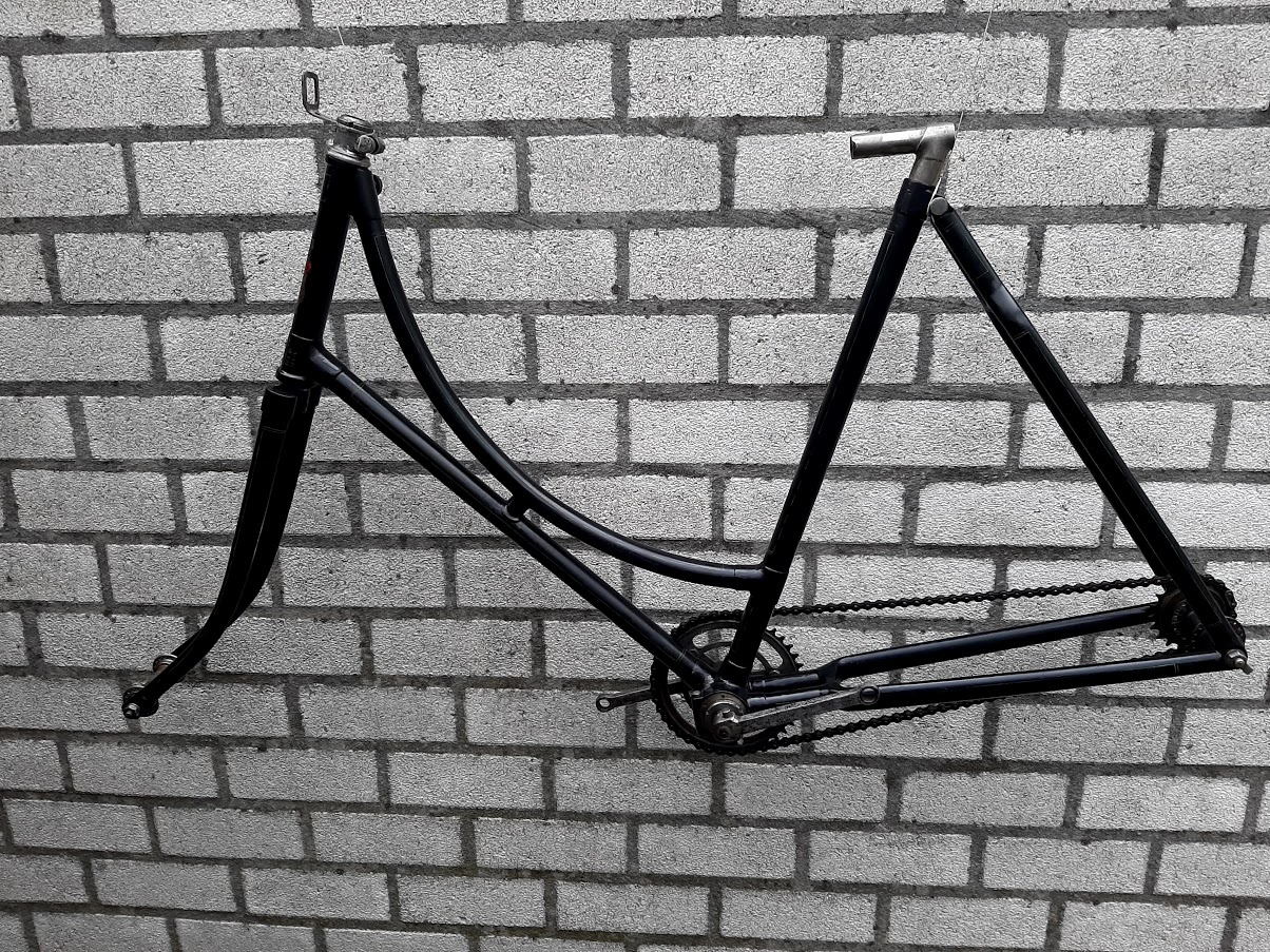 Het is nog geen fiets, maar de kenmerkende onderdelen van dit model met excentrische trapas zijn weer in goede staat en werkend (met dank aan Maarten Waarle). Het is een vernuftig mechaniek die verstelbare trapas, maar ook wat onhandig om te stellen.