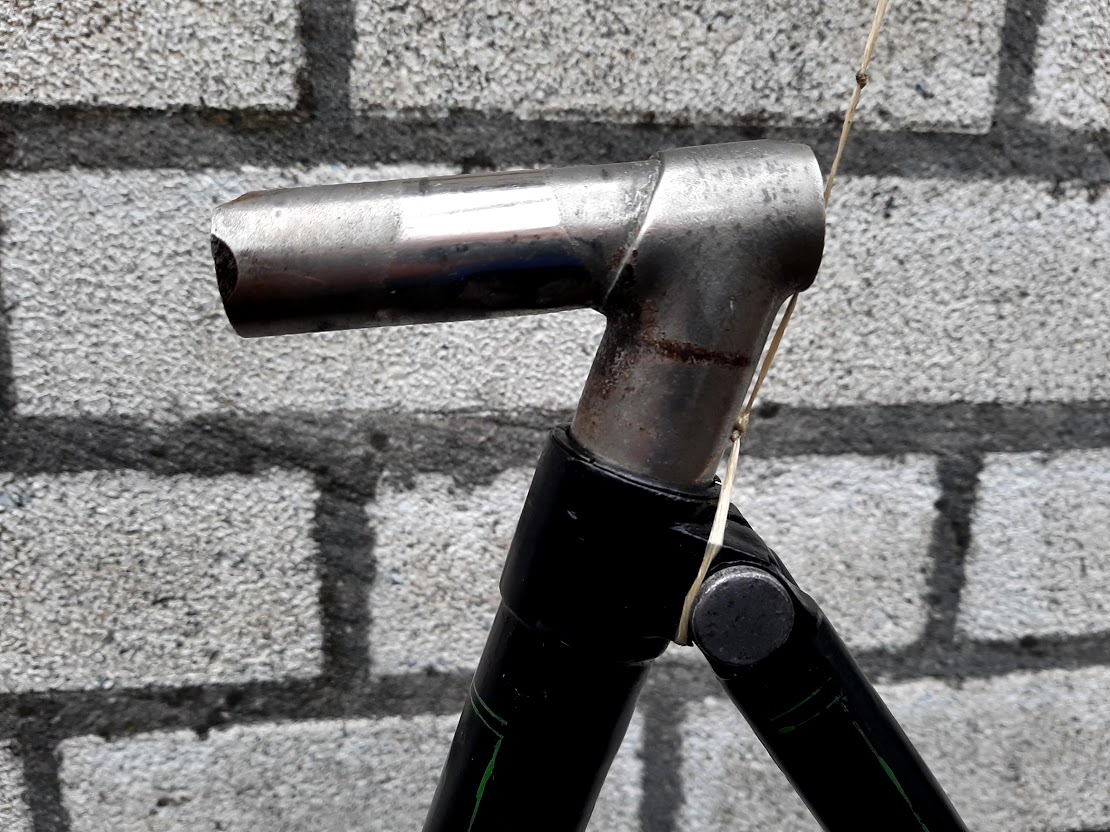 Het lijkt overigens alsof de verf bij de cranks en de balhoofdstrop is weggekrabd met een schilmesje. Zouden deze onderdelen niet beter gestraald kunnen worden? Of moet je dan sowieso opnieuw vernikkelen?