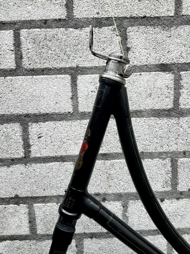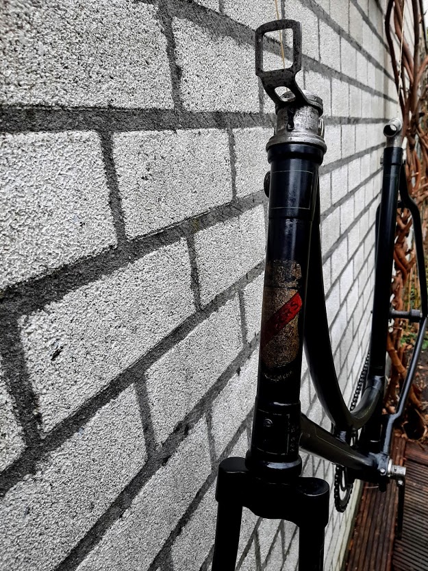 De fiets in aangetroffen staat had een stuur van eind jaren 30 en ook een (slecht) voorwiel met trommelrem uit die tijd. Achter zat een wiel met trommelrem uit 1979. Maar als er in de jaren 30 niets is veranderd aan de cranks/overbrenging, waarom zijn die er dan van af gehaald; mogelijk omdat hij toen opnieuw gemoffeld is? (moet ik nog onderzoeken). De vork (lijkt niet origineel) heeft weer een ander revisienummer trouwens.