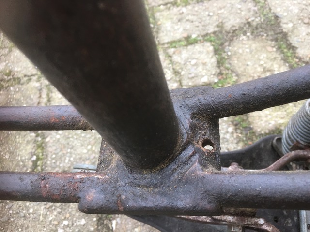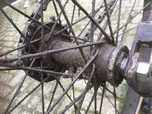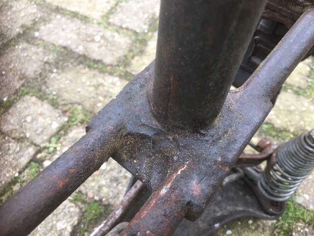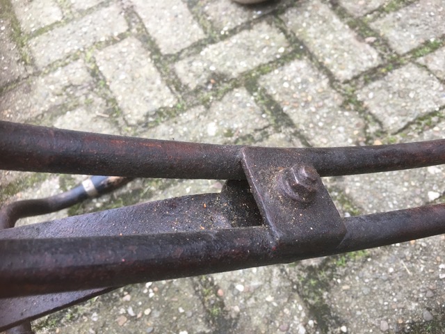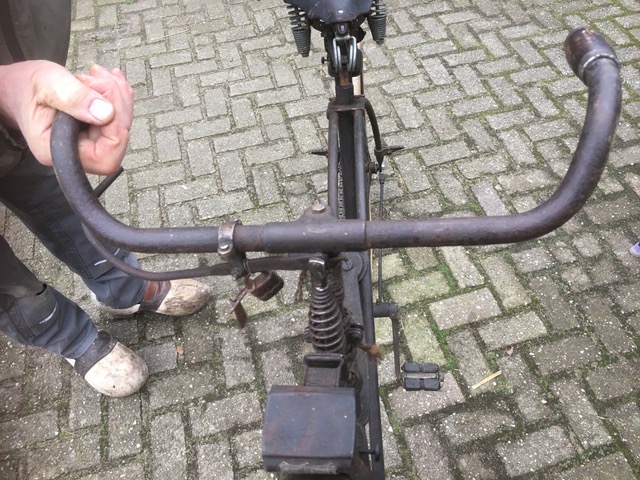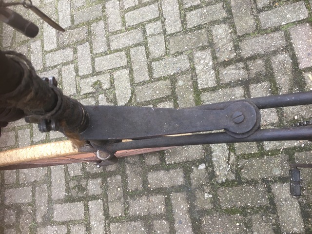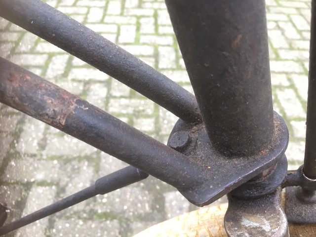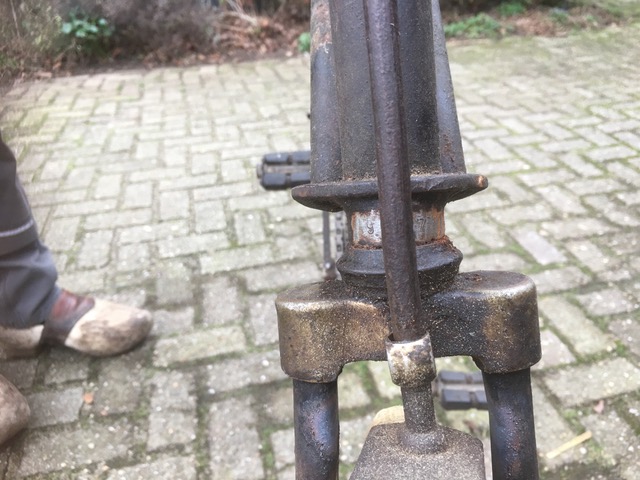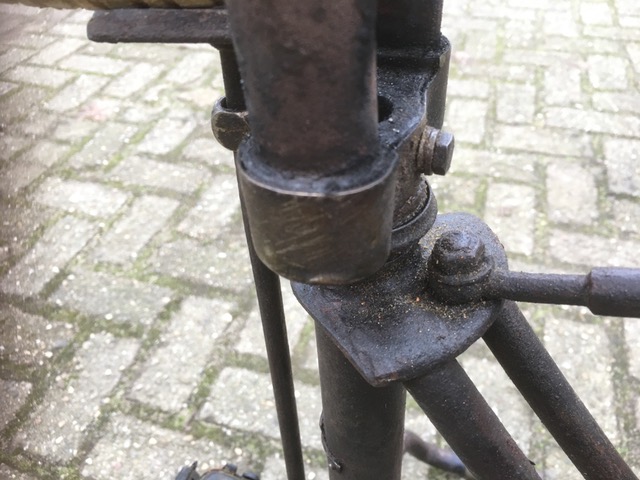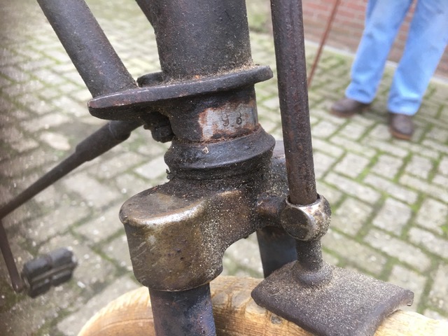Vanmorgen was ik met Theo bij deze fiets en ja de hoofd verbindingen zijn gelast. Als je even de moeite neemt over het lassen met acytylern dan is de start rond 1834 en rond 1870 waren er goede verbindingen te lassen. Ik neem aan dat een creatieve smid deze fiets heeft samen gesteld. Dat het een comfortabele fiets is om mee te toeren sluit ik uit. Dat is in mijn ogen die reden dat er maar 1 is gebouwd. Er staat onderaan de balhoofdbuis 98 7 en ga er van uit dat de het bouwjaar en maand is. Het achterwiel: de is voor een Rondsnoer rubber en Martin heet een maat band die er net op blijft zitten. De as met achtertandwiel zijn ook passen in 1898. Ketting is nieuw en het voorblad is vervangen door een 3mm voor tandwiel. De voorvork is vervangen maar door een amateur even als het stuur. Voorwiel is ook vervangen.