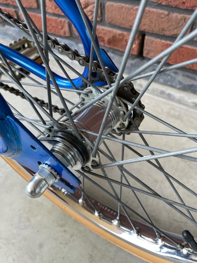 Dat begint al aardig uit de hand te lopen , en met alles wat ik op een echt oude fiets liever niet zie, dopmoeren,shimanonaven, komt dat spul ook eens te plak. Mooi hoor !