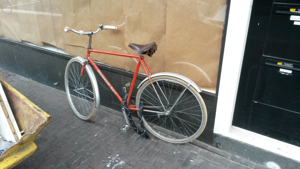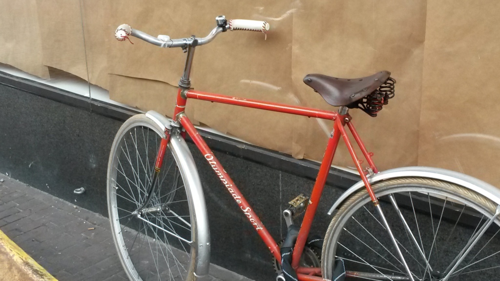 Alweer wat jaren geleden kwam ik deze Olympia sportfiets in Amsterdam tegen. Helaas omgebouwd naar terugtrapper en slechts nog een paar originele onderdelen aanwezig. Ik vermoed dat hij geheel Campagnolo afgemonteerd moet zijn geweest. Ook heeft hij nokjes voor een bagagedrager.