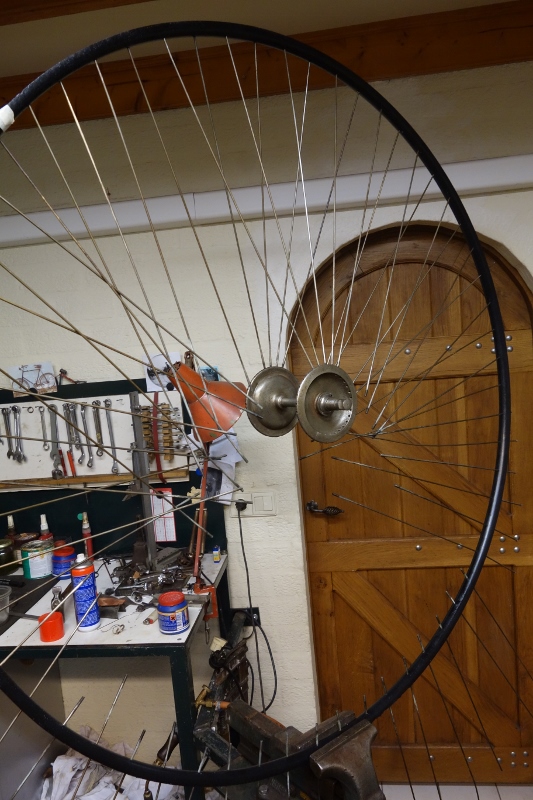 Spaken heb ik bij deze Singer opgebouwd uit een dikker kort deel en dunne lengte die ik samen heb gesoldeerd. Heel bewerkelijk ook weer maar als je je zelf braaf aan het werk houd dan kom je uiteindelijk bij spaak 60 uit!