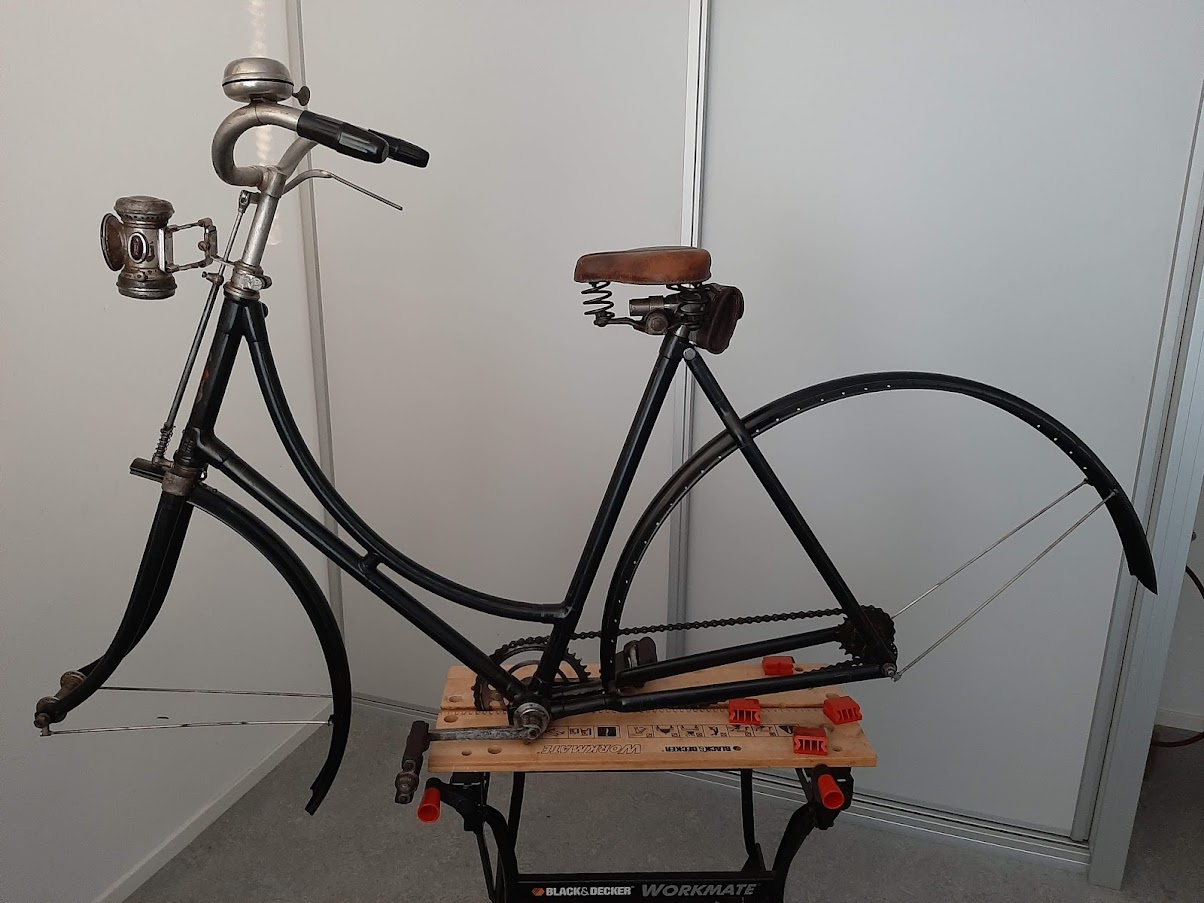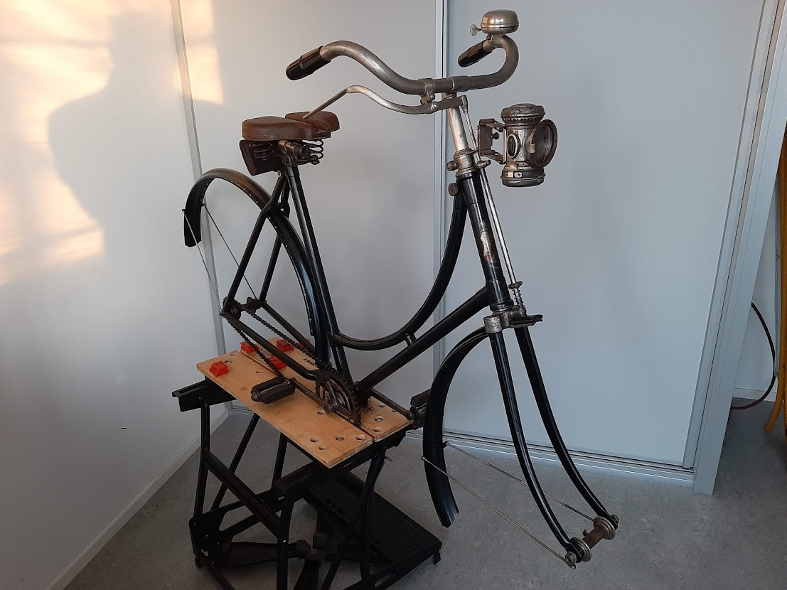 Wat hebben we gedaan in het restauratieproces? Nadat de fiets helemaal was gestript bleken alleen het frame, het trapstel en de stuurstrop met lampbeugel origineel. Een flinke opgave om de fiets weer zo origineel mogelijk op te bouwen aangezien onderdelen uit deze periode nauwelijks nog te vinden zijn. Een greep uit de werkzaamheden:
