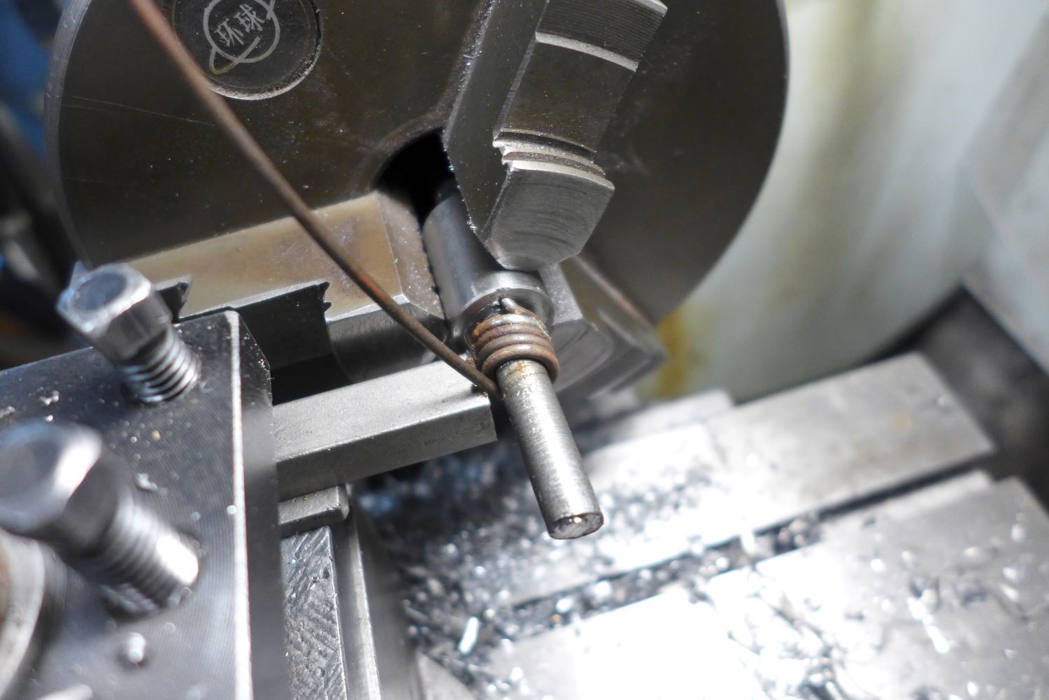 Ik zag er een beetje tegenop maar dat bleek niet nodig. Het was een vrij simpel karweitje met de draaibank.] Aanvankelijk had ik een een dunner asje vanuit de redenering dat de veer wel weer naar een grotere diameter zou terug veren .Dat bleek mee te vallen waardoor mijn eerste veertje een te kleine diameter kreeg.