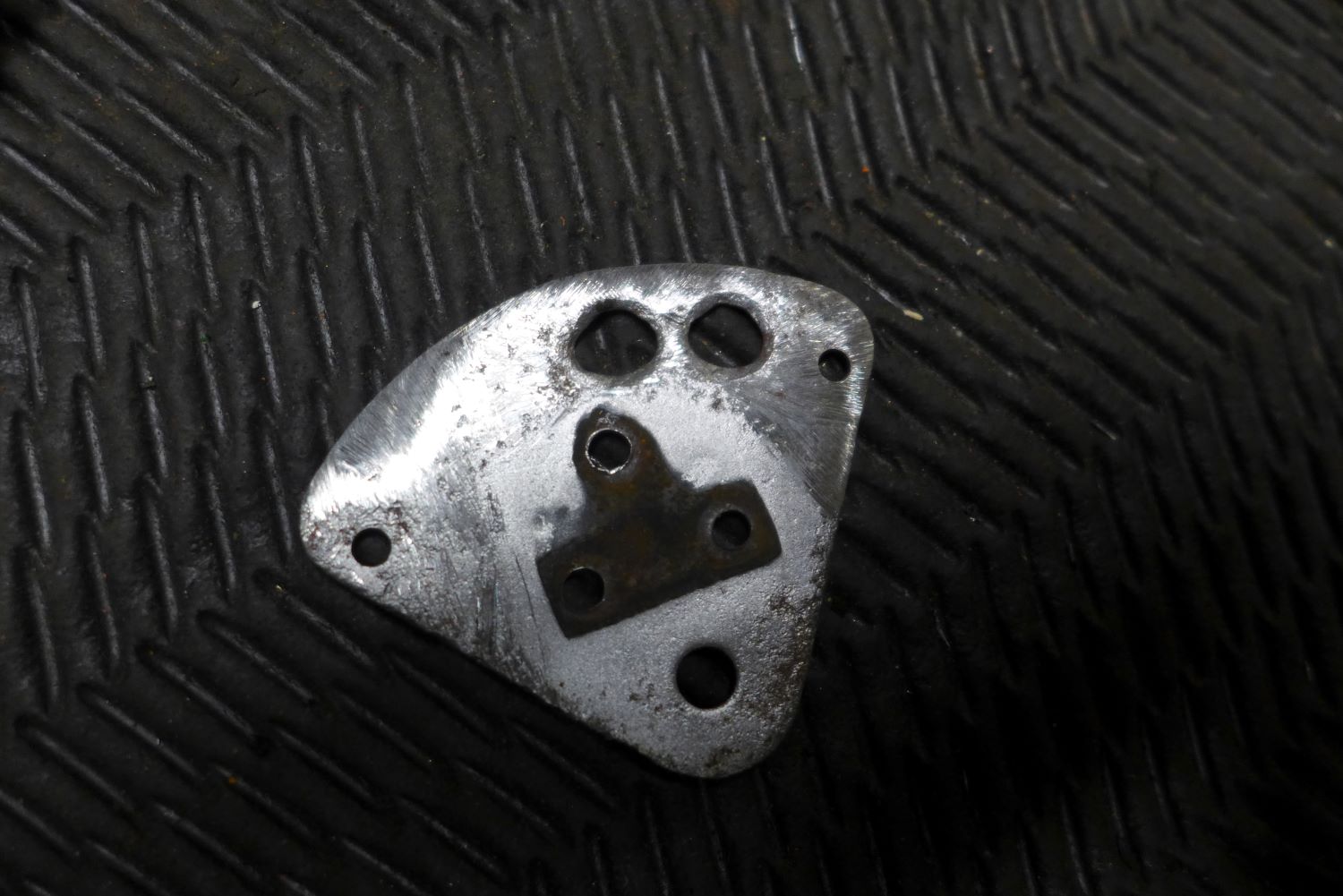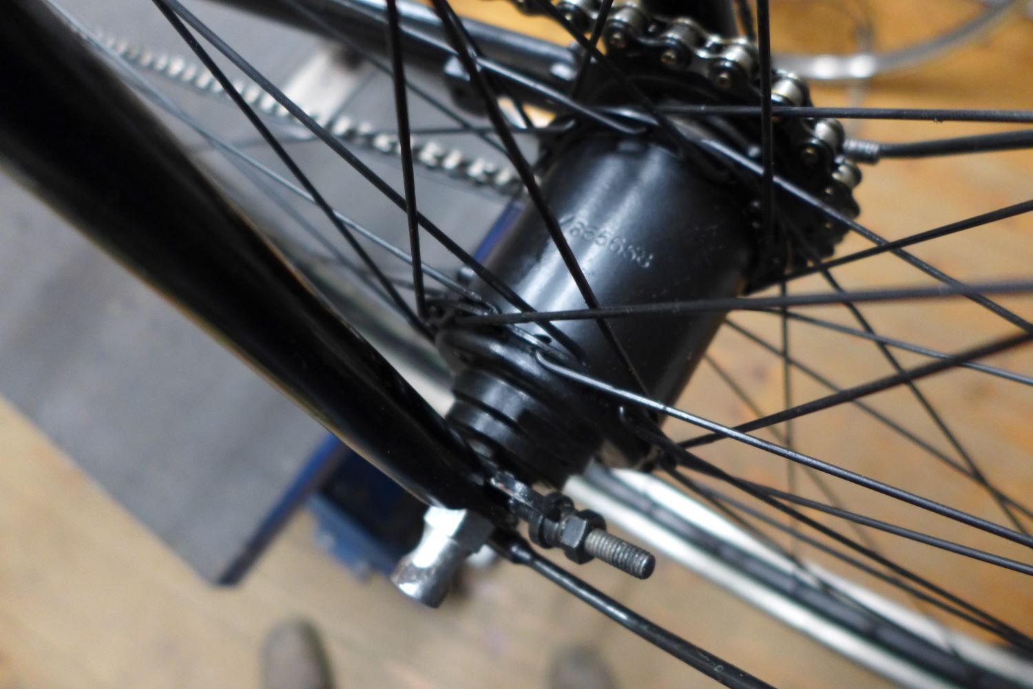 De S.A. buisversteller moest ook nog wat herstelwerk ondergaan. Behalve dat de buisklem moest worden verlengd om om de grote diameter Fongers bovenbuis te passen had de oude versteller last van uitgesleten positieogen in de achterplaat. Omdat de versteller een eenvoudig geklonken ding is kan je vrij makkelijk het ding uit elkaar halen en onderdelen vervangen. Ik heb er dus maar een andere achterplaat in gezet en daarna de boel weer vast geklonken. De achternaaf is een K uit 1928. Een jaartje te vroeg maar daar kan ik wel mee leven.