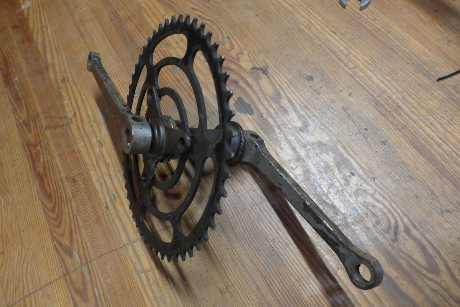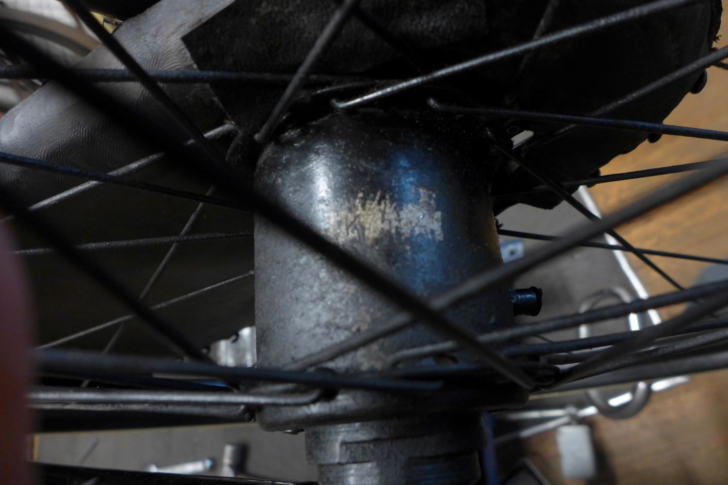 Zo is er al een X naaf met stuurversteller, hele dunne dubbelbutted spaken (no15) en een trapas met groot Fongers tandblad en cranks. Gaat iets moois worden. De achternaaf die er nu in zit is een K naaf uit 1927.Dat zal het jaar zijn geweest dat de fiets naar de Fongers fabriek is geweest voor een opwaardering. De remstangen bij het balhoofd zijn toen gemoderniseerd en er is een versnellingsnaaf van die periode in gezet.
