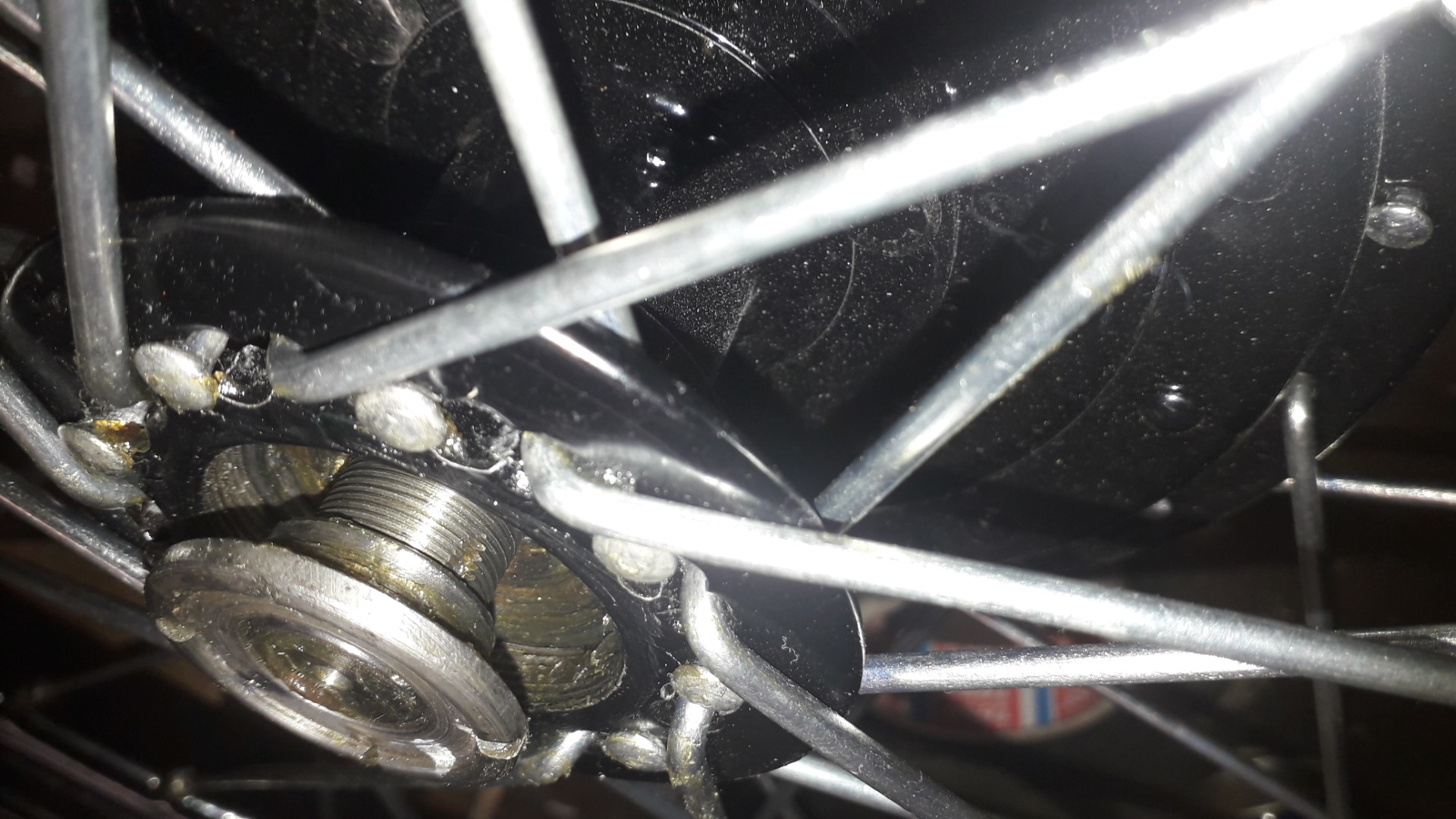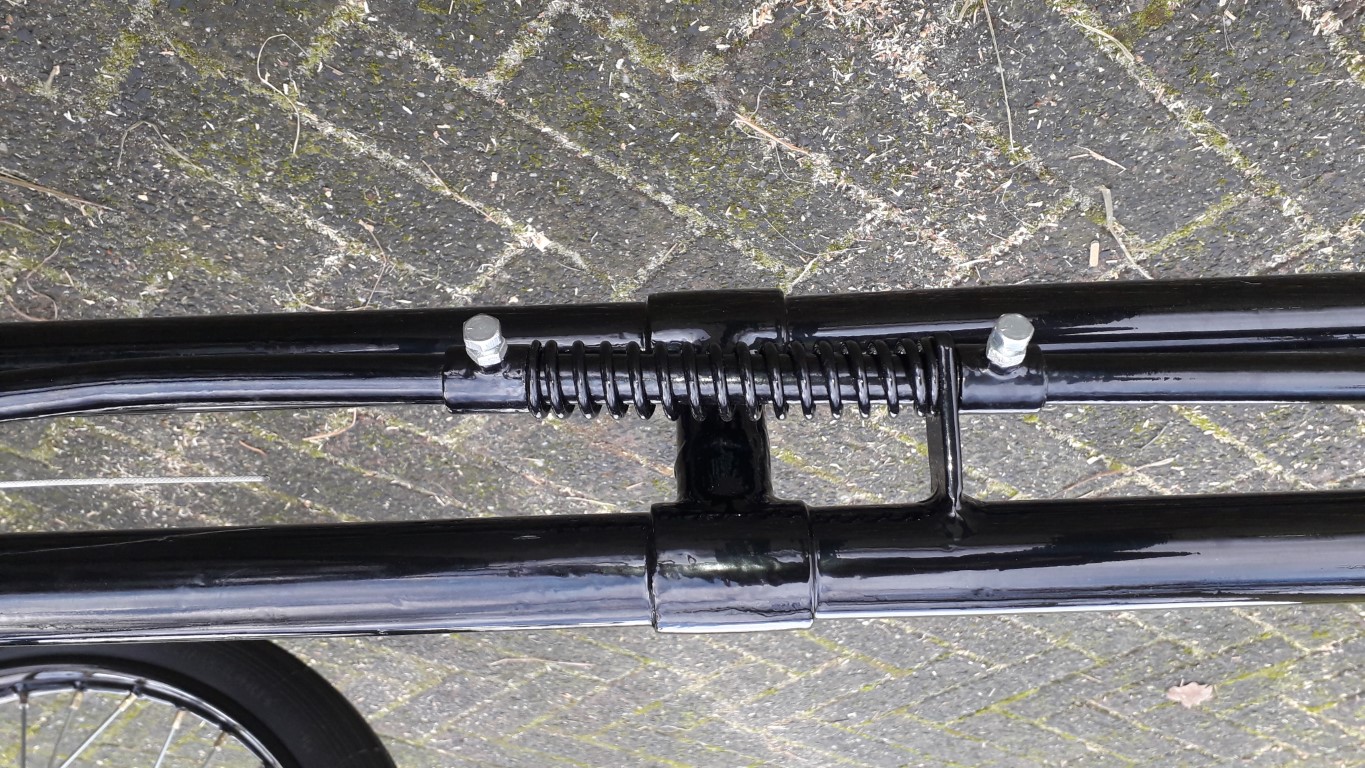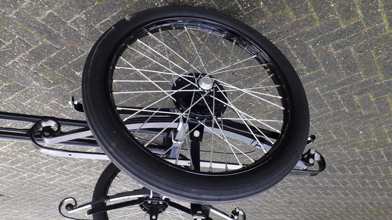 Op deze foto de aangepaste as met de losse onderdelen: Na een beetje stoeien en fröbelen kan ik eindelijk mijn andere wiel ook weer opbouwen en gereedmaken voor montage: