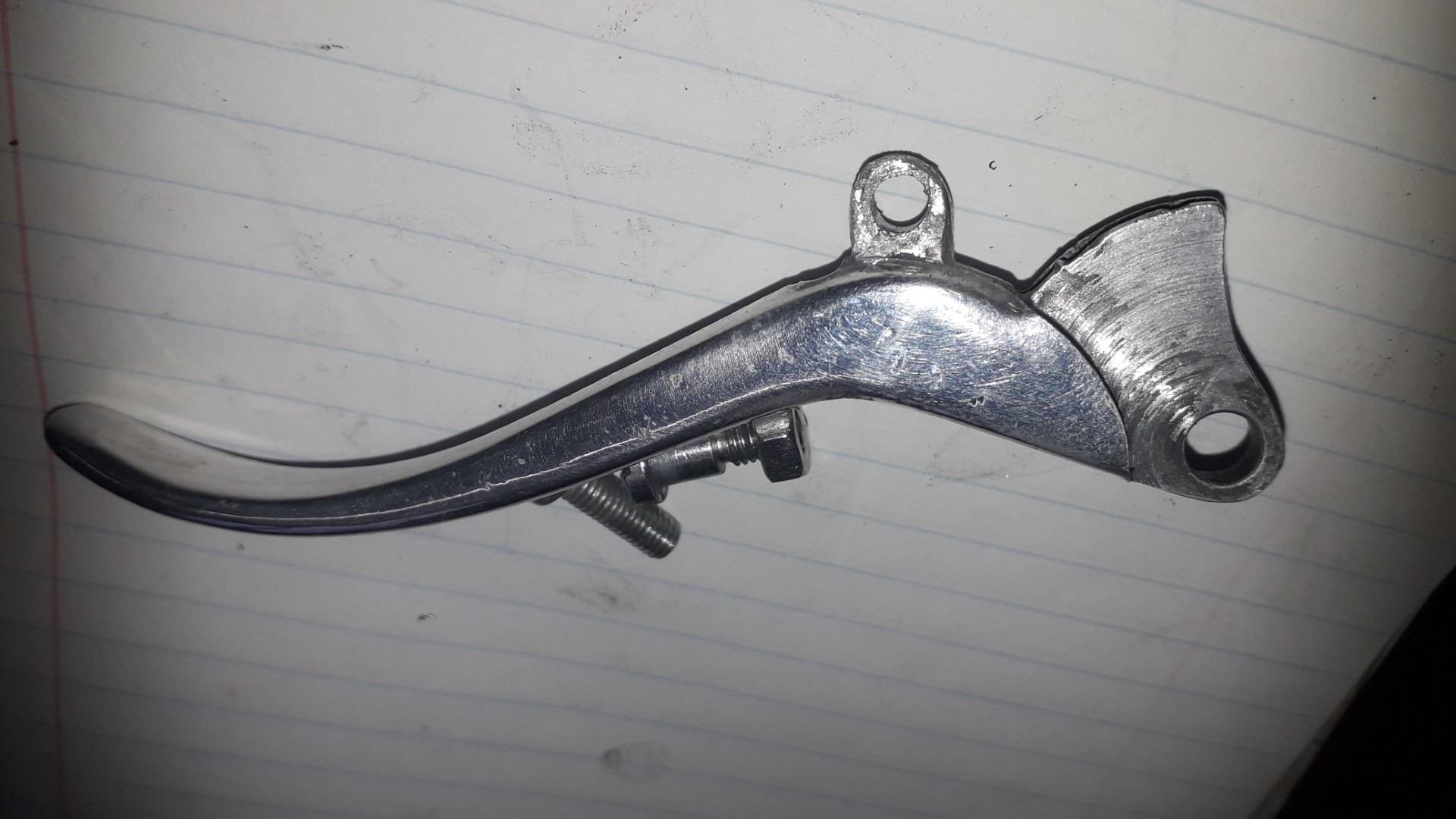 Indien de motor loopt, en je staat even stil, bijv. voor een verkeerslicht, is het mogelijk het motortje in zijn "vrij" te zetten, d.m.v. een hendeltje ààn de koppelingshendel. Het aluminiumoogje wat daarvoor aan de koppelingshendel is aangebracht was behoorlijk "uitgelubberd". Om problemen in de toekomst te voorkomen heb ik met 2 componenten alumniumpasta het gaatje eerst opgevuld, vlakgemaakt en vervolgens een nieuw gaatje ingeboord. Een nieuwe binnenkabel voor de koppeling gemaakt en het zwikkie maar eens gemonteerd. Ook dat is weer opgelost.