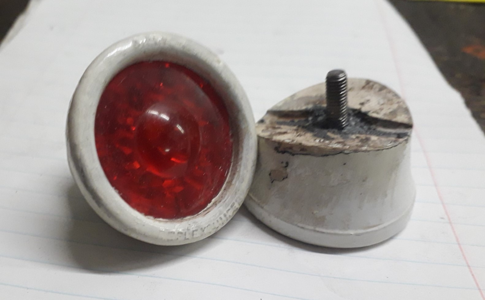 Omdat ik graag zoveel als mogelijk de originele onderdelen wil hergebruiken, heb ik een M5 boutje weer in de kunststof behuizing weten te "prutsen" en de ruimte opgevuld met "vloeibaar" aluminium (2-componenten). Daarna de kunststof behuizing van oude verflagen ontdaan. Daarbij kwam er weer een tekst op de behuizing zichtbaar: BIBIA REFLEXBUMPER. Ik kende BIBIA eigenlijk alleen maar maar van snelbinders, maar nu dus ook van reflectortjes uit vroeger jaren! De rode reflectorglaasjes afgeplakt en de behuizing wit gespoten (RAL 9010), net zoals de spatborden moeten worden. Weer een onderdeel klaar voor hermontage.