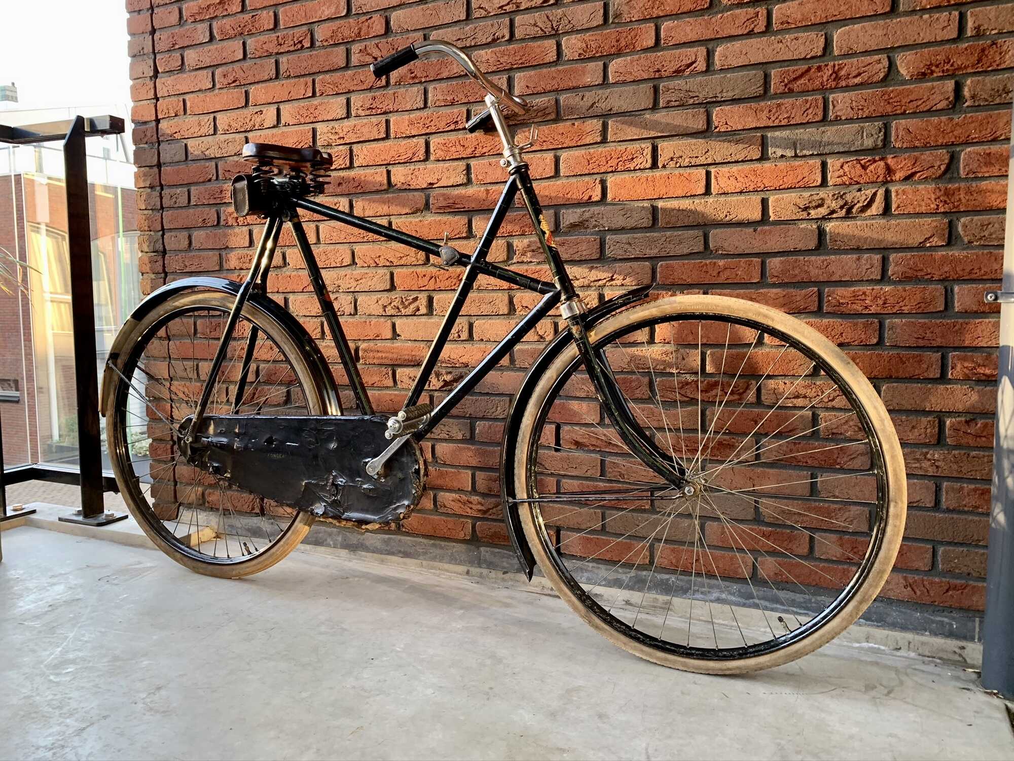 De fiets heeft ook een S.A. drie versnellingen versteller op het stuur. Zo`n grote dikke van rond 1905-07.