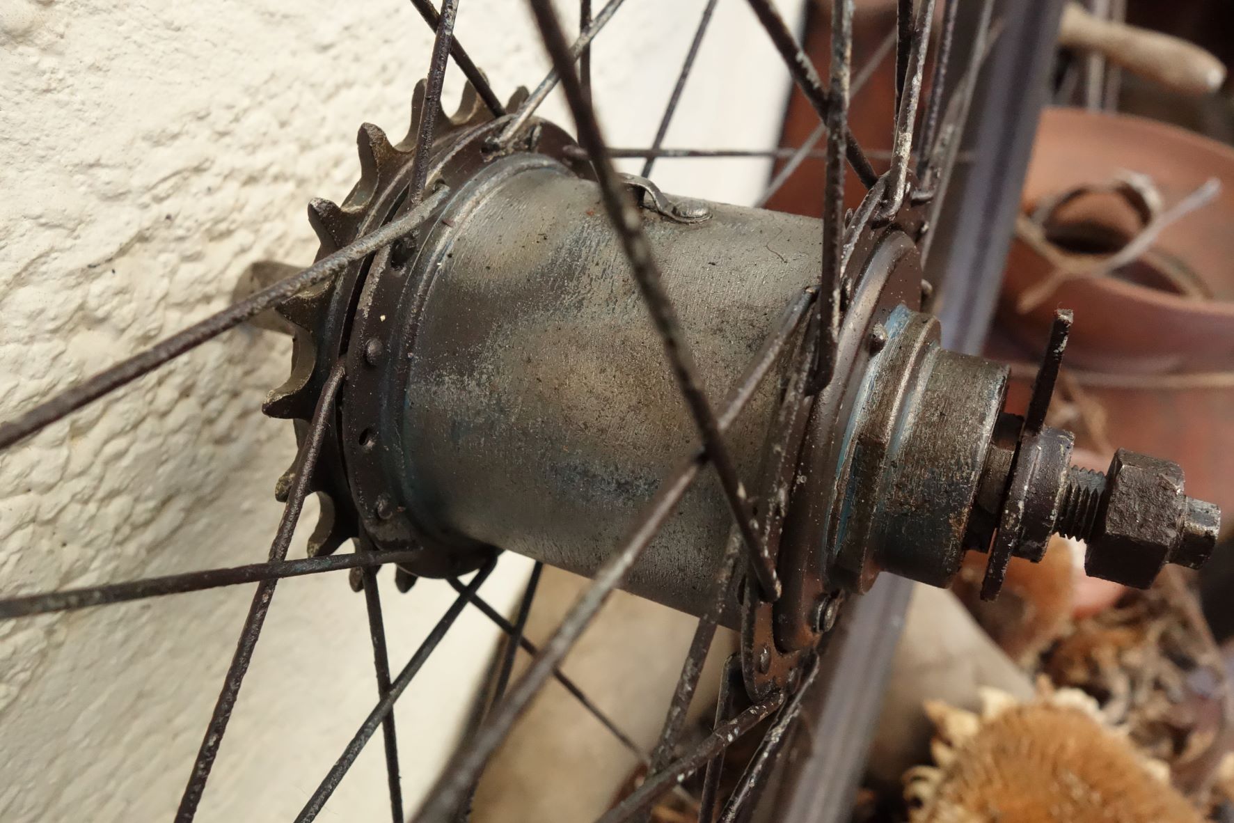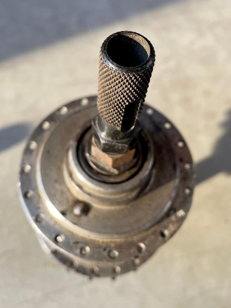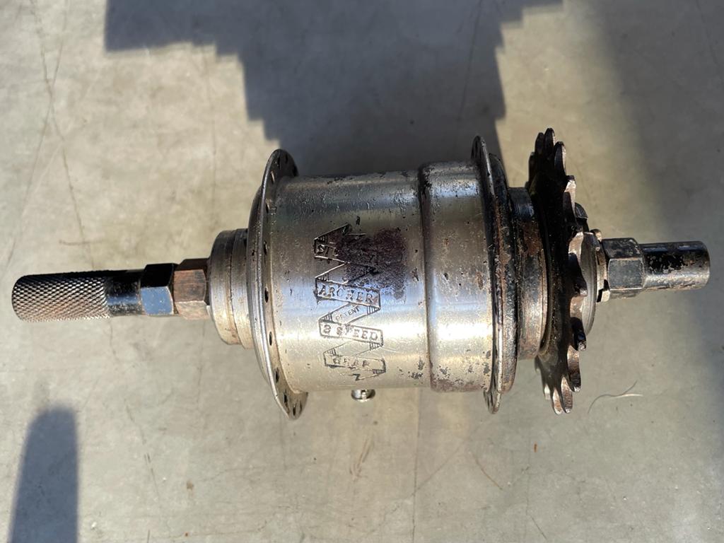 Het is een schitterende vondst deze fiets ten eerste. Ook een hele mooie SA naaf. Heb je de versteller er ook bij?