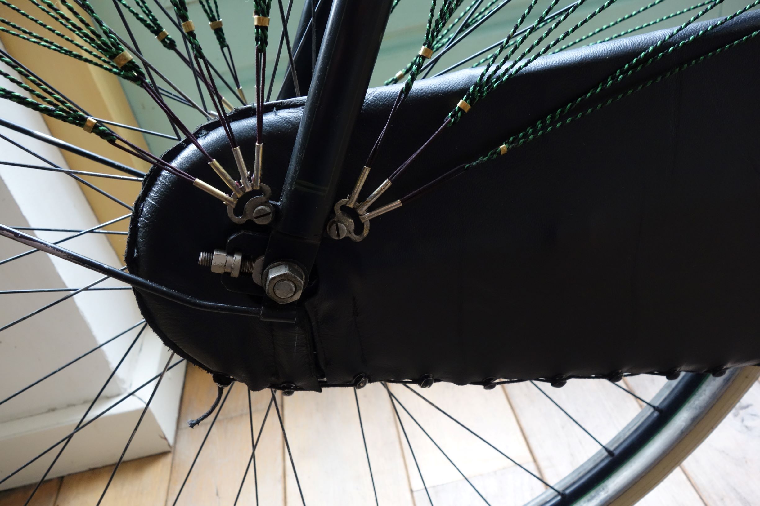 Ik kwam rond de staande achtervork en de achterrem wat in de problemen met de touwtjes maar gelukkig kon ik op de beeldbank foto`s zien dat ook Fongers het niet helemaal gelukt was om het patroon van vier gebundelde touwtjes vol te houden. ze hebben net als ik ergens een vijfde touwtje erbij geknoopt.