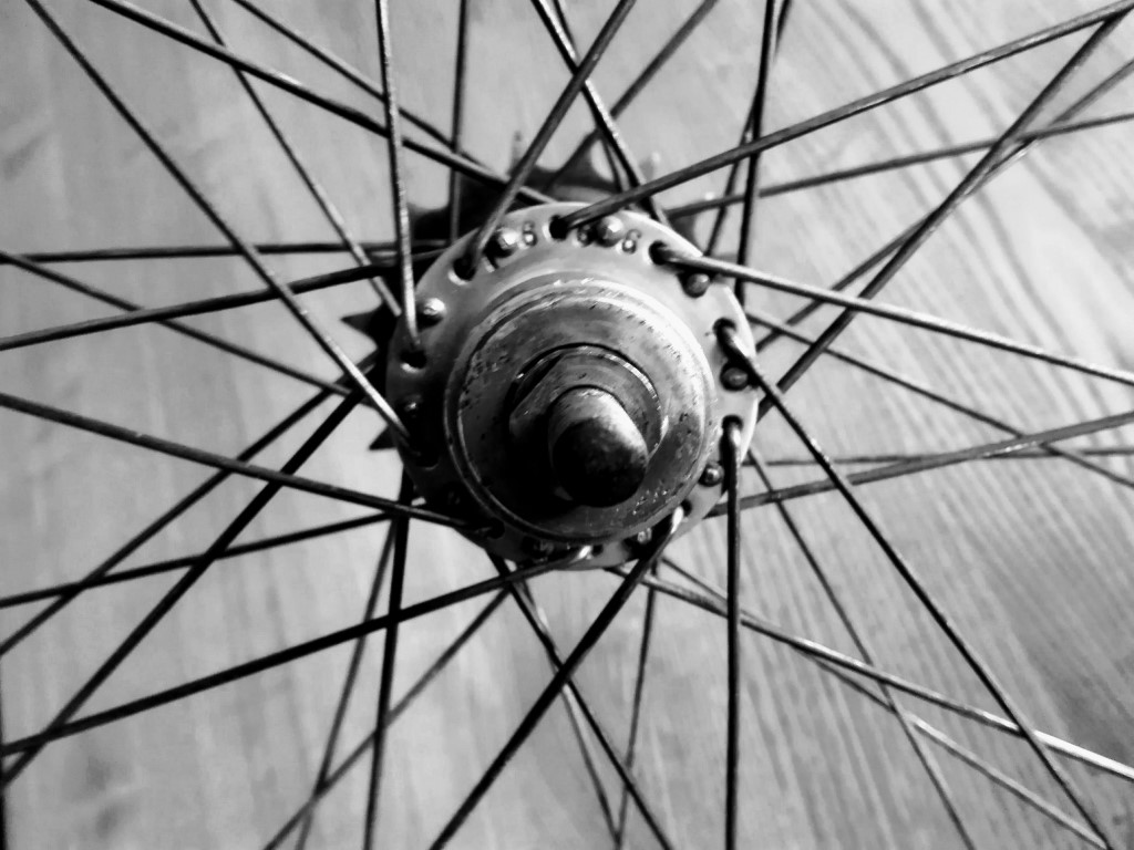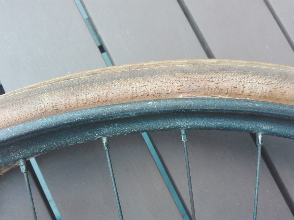 Achterwiel schoongemaakt; mooi recht met brede 40 spaaks velg. Heb een nieuw setje Vredestein Classic banden van 30 jaar oud op de kop kunnen tikken, dat wordt wel chique.