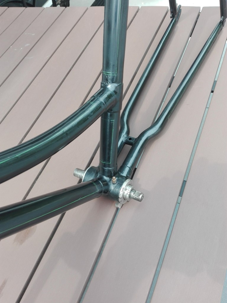 Het frame van de DZ 1909 is inmiddels klaar. Veel werk gehad aan schuren, spuiten en bewerken. Ik heb er zijdeglans op gespoten en daarna het oude biezenpatroon zo goed mogelijk opnieuw aangebracht. Voor Fongers fietsen van voor 1910 ziet dit er anders uit dan daarna: er wordt een lichtgroene lak gebruikt, enkele biezen en dwarsstreepjes die dicht op elkaar staan. Bijgevoegd ter illustratie een voorbeeld van een DZ uit 1908 in de originele lak. Daarna heb ik gedaan wat Maarten B. suggereerde: het geheel heel licht geschuurd met 1000-papier en vervolgens gepoetst met Commandant. Dat geeft inderdaad een mooi, doorleefd effect. Biezen en transfers worden gelijk wat aangetast, zodat de 'knallende' nieuwe lak een andere aanblik krijgt. Bijgevoegd wat detailfoto's. Even ook voorwiel en stuur erop gezet, het belooft mooi te worden.