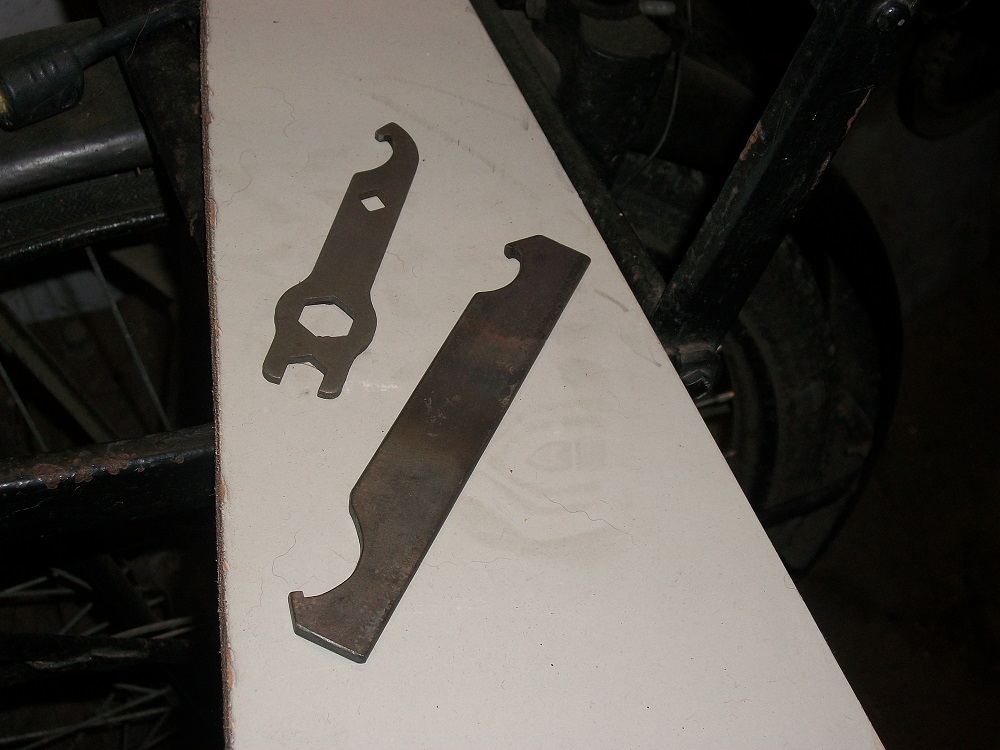 En een oude Torpedo naafsleutel een beetje gevijld, om de conus vast te houden bij het stellen en vastdraaien van de opsluitmoer.