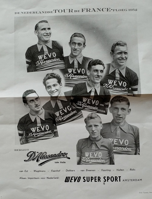 Ik heb een Wevo Supersport uit de 50/60-er jaren en ben bezig om meer informatie over dit merk te verzamelen. Onlangs via de zoon van Leo van Oest (1 van de oprichters van Wevo) een foto ontvangen van de TdF ploeg 1952. Naast die informatie ben ik ook benieuwd of er ergens nog zo'n mooi WEVO D'Allesandro shirt is te krijgen ? Bedankt alvast voor alle reacties.