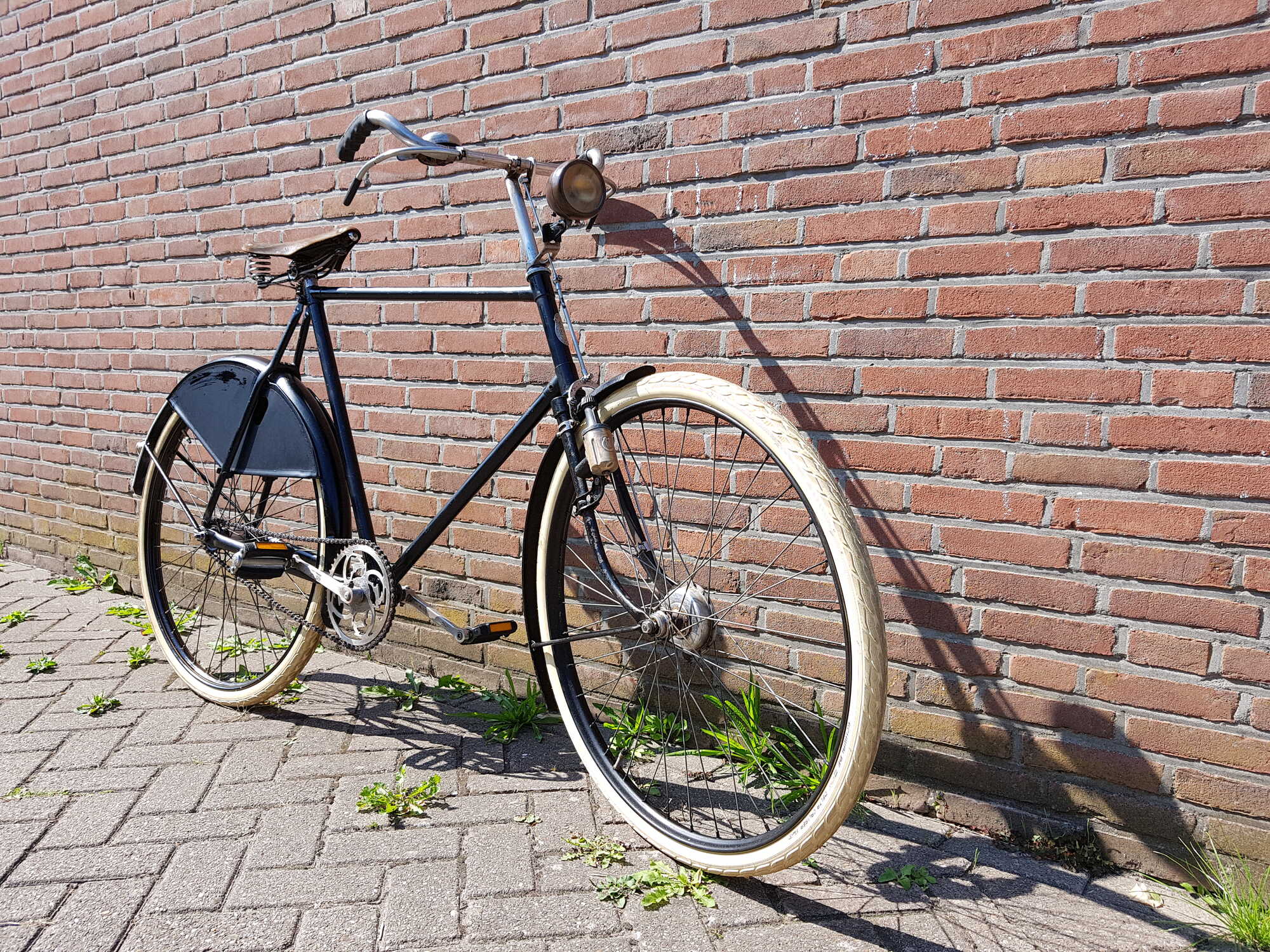 Ik ben deze fiets eind 2002 al eens tegengekomen. Toen was hij in handen van een sleutelaar in Brabant en zat er nog een qua leeftijd kloppende F&S Torpedo-naaf in. Het voorwiel was niet origineel en ook de spatborden klopten toen al niet. Ik ga er dus van uit dat de fiets van oorsprong een gewone terugtrapper was.