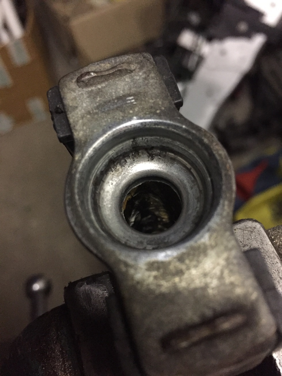 R pedaal gedemonteerd - flink beschadigde cup en conus, conus lijkt ook dun (doorgesleten). Foto lijkt minder erg dan het is.