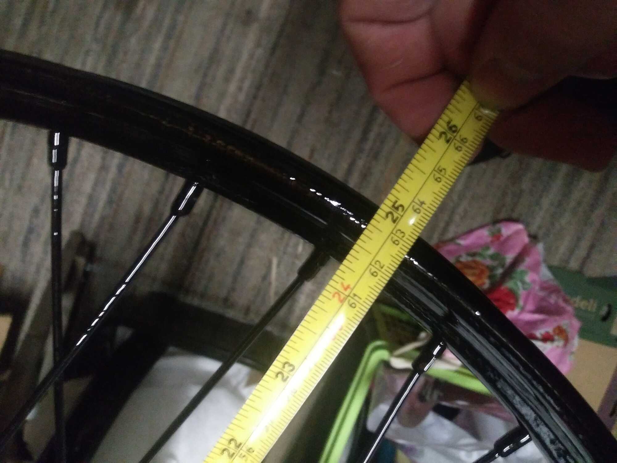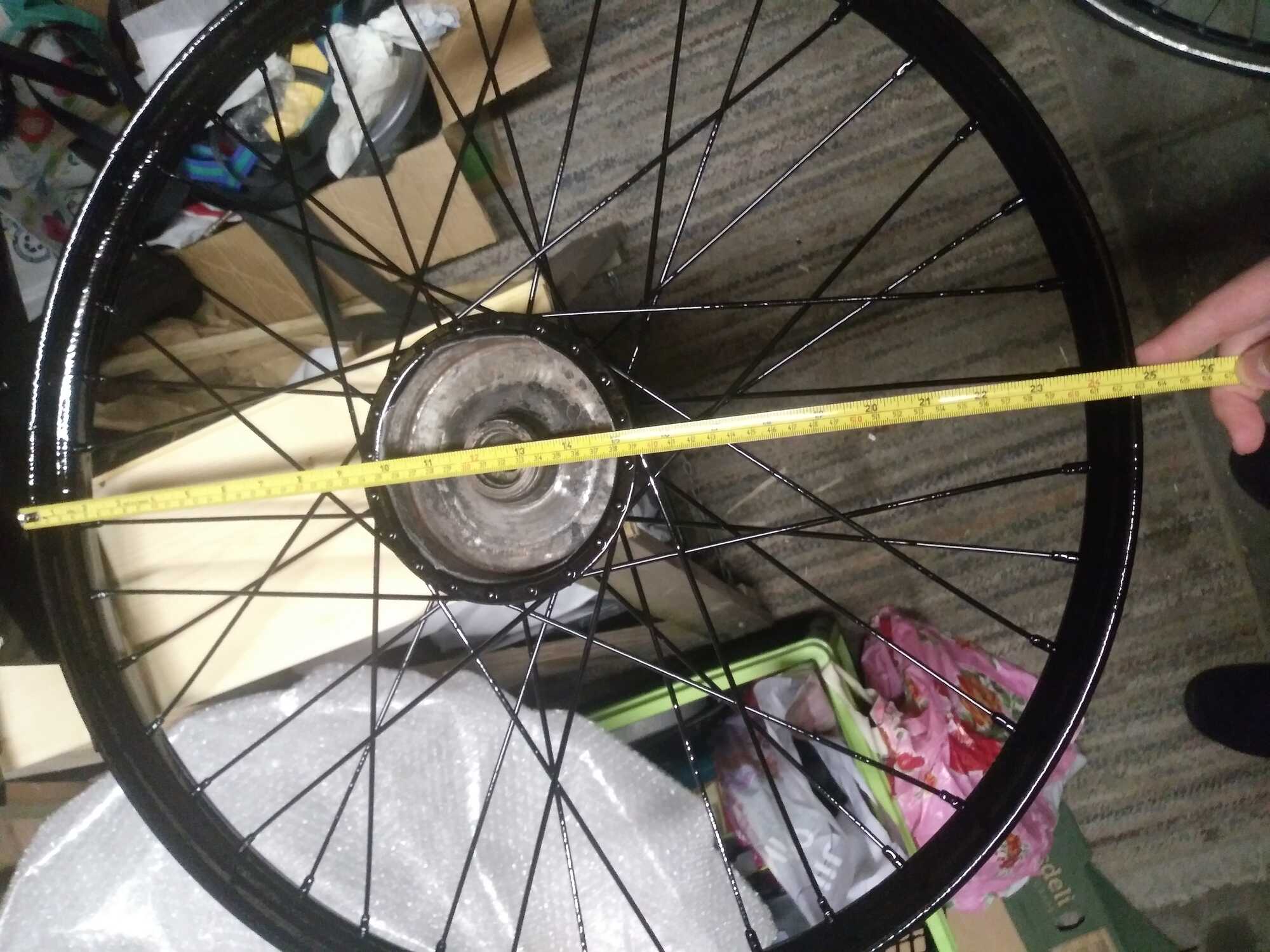 De diameter is van toepassing op de binnenkant van de velg waar de hiel van de band rust, niet de buitenrand. Gezien de breedte moet dit haast wel een oude maat 28x2" wiel zijn. Dat komt neer op 50-609. In de jaren '30 waren 3 maten wielen in gebruik bij bakfietsen: 26x2", 28x1,75" en 28x2". 26x2" en 28x1,75" bestaan nog, 28x2" is na de oorlog niet meer gebruikt, en dus bestaan er ook vrijwel geen banden meer van. Er is geen moderne band in die maat. Wat tegenwoordig als 28x2" wordt verkocht is 50-622, en past dus niet. Het is aan te raden om het wiel om te bouwen naar 28x1,75". Dan blijft de buitendiameter van de band gelijk (28", ofwel ongeveer 711mm). 28x1,75" is veel gebruikt als achterwiel, en voldoet prima. Het is alleen wel zo dat moderne 28x1,75" niet voor bakfietsen bedoelt zijn, en de zijwanden vaak niet sterk genoeg zijn. Tot nu toe gebruik ik nog steeds Vredestein Transport Extra Zwaar banden. Die zijn een aantal jaar uit productie, en inmiddels ook moeilijk te vinden, of duur (50 a 60 euro per stuk voor een nieuwe), maar doen het goed.