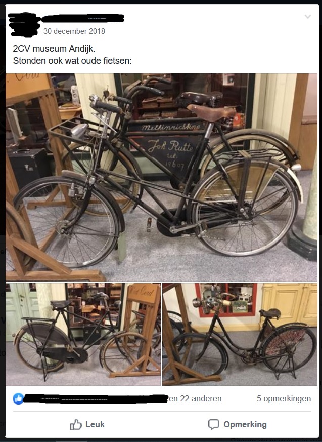 Omdat er al een aantal reacties was op het bericht en er zelfs al gesproken werd dat het een Fongers zou zijn ging ik er vanuit dat de jacht reeds geopend was. Mijn eerste actie was dan ook om contact op te nemen met het 2CV museum in Andijk met de vraag; Weten jullie hoe bijzonder deze fiets is en is deze fiets te koop?