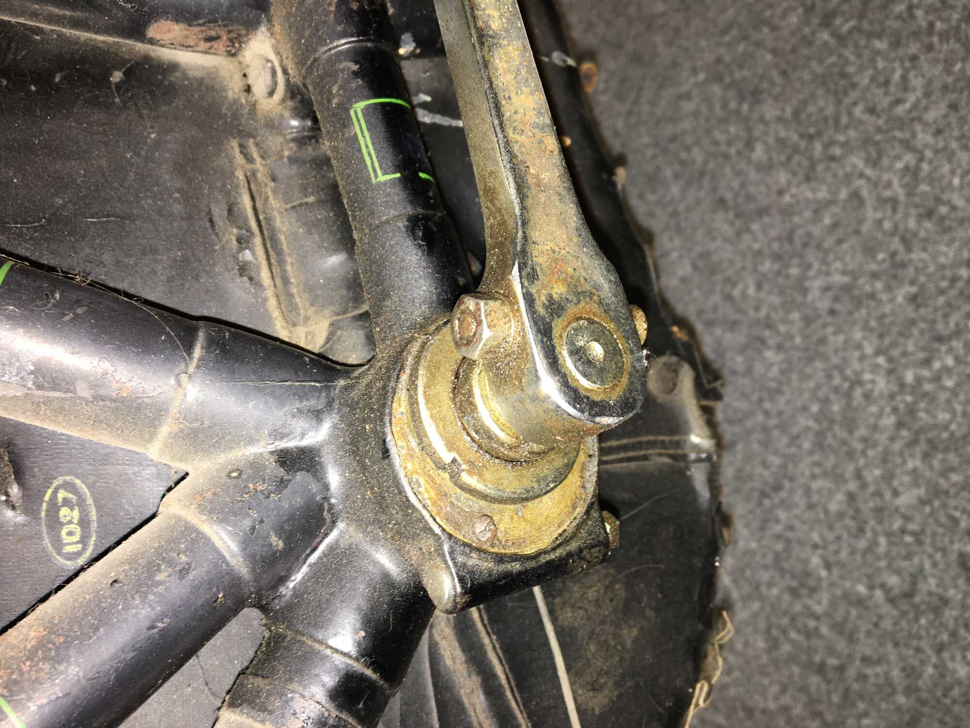 Wat me opvalt is dat de schuine buis vanuit de trapas midden tussen de gebruikelijke framebuizen vertrekt. De trapaslug met drie uitgangen naar voor en boven.