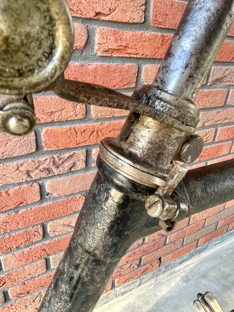 Het stuur op de foto lijkt zwart met nokjes waar ooit een remsysteem aan heeft gezeten. Een dergelijk stuur zit er nog steeds op hoewel het celluloid is verdwenen (delen er van zaten er nog op toen de fiets in 2007 boven water kwam begreep ik van Andre). En tot slot is de framemaat hetzelfde.