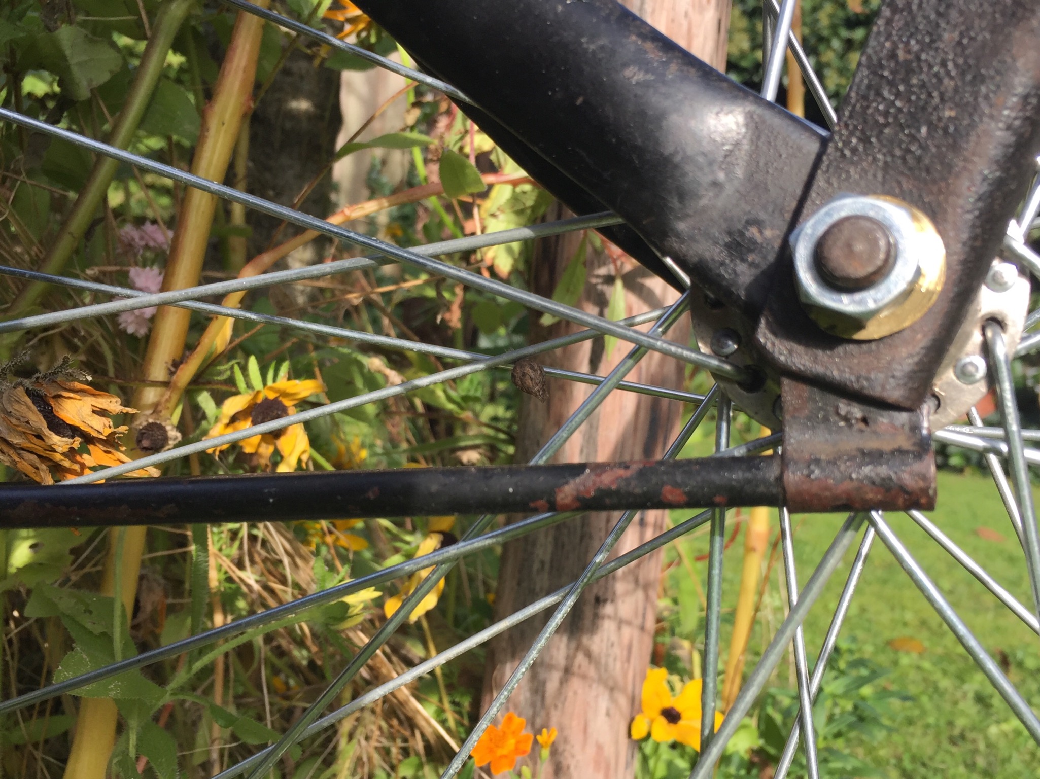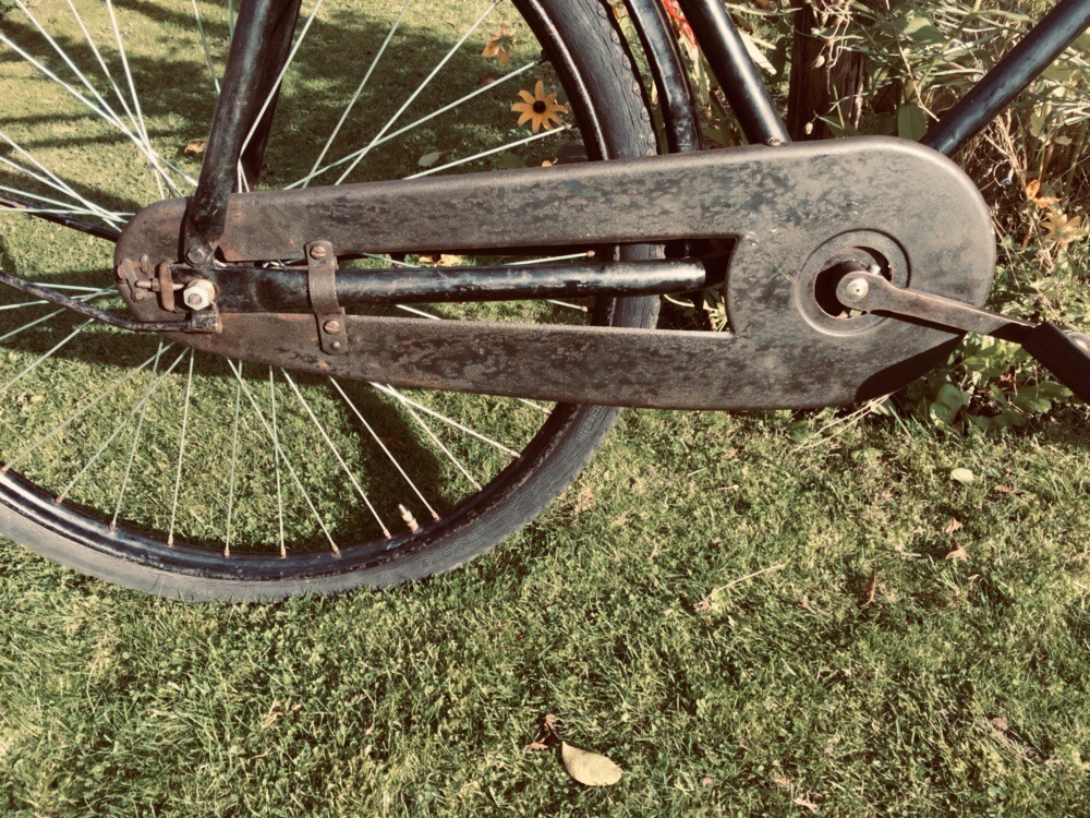 Omdat ik nog een brede Torpedo uit 1935 had liggen heb ik die er in gespaakt. Ik heb eerst de kettinglijn weer recht gezet en daarna de spaken gespannen en de velg in lijn met het frame gespaakt. Ik heb ooit ergens opgepikt dat die manier van spaken ‘paraplu gespaakt’ wordt genoemd. De ketting en de wielen staat zo weer in lijn.