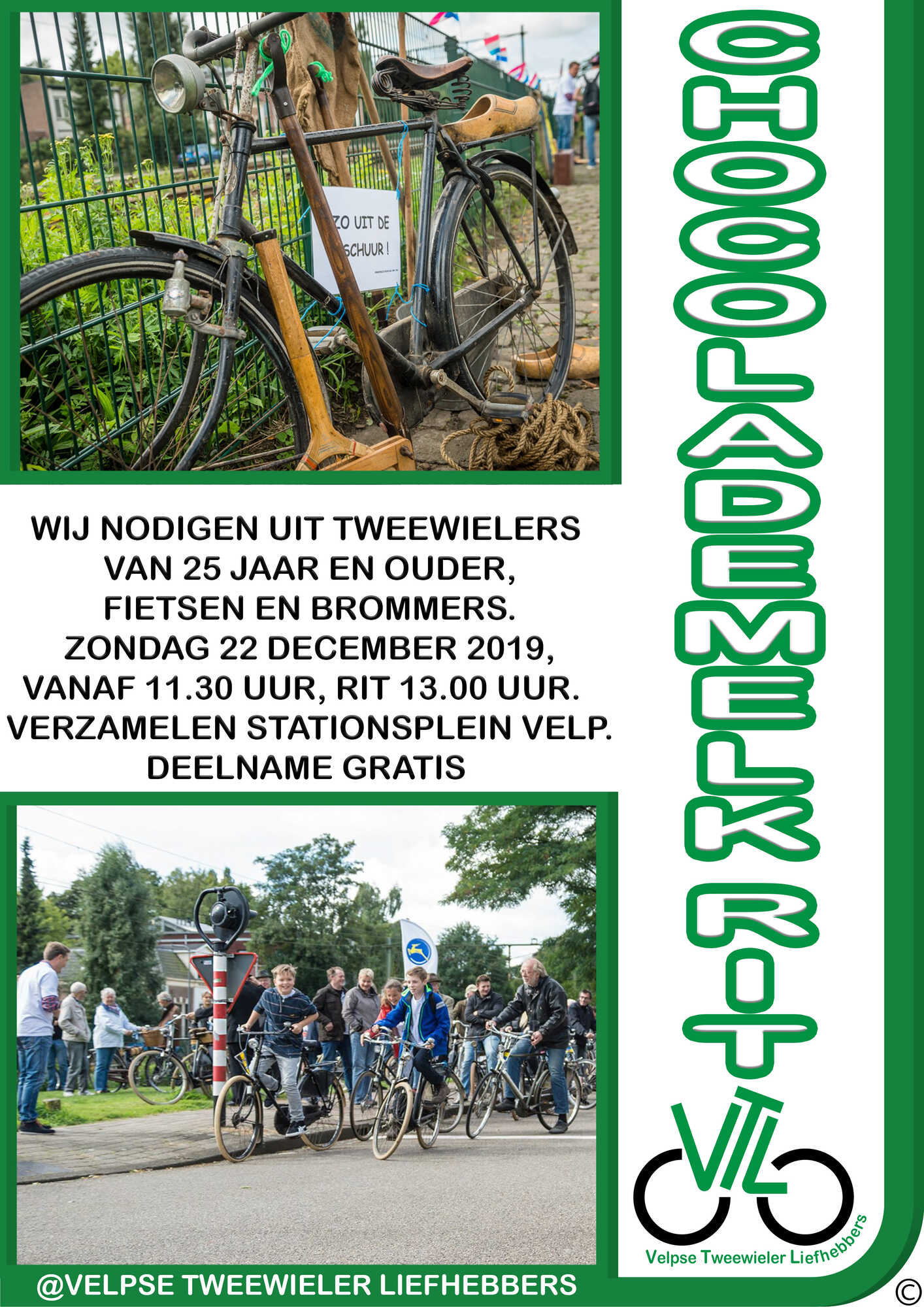 Zondag 22 december 2019 nodigen we liefhebbers van fietsen en brommers van 25 jaar en ouder uit deel te nemen aan de bijeenkomst in Velp. We verzamelen vanaf 11.30 uur en gaan de rit rijden om 13.00 uur. Plaats; Stationsplein Velp bij Arnhem. Deelname kost niets een bijdrage mag. Om een beetje inschatting te krijgen hoeveel rijders er komen kan er gereageerd worden via het formulier in de link; https://docs.google.com/…/1FAIpQLSd7sAR ... …/viewform…