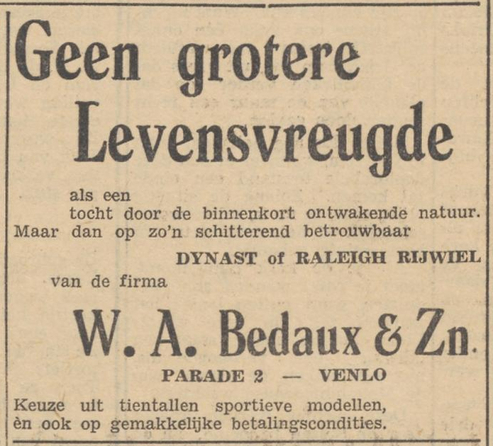 Als je op Delpher gaat zoeken op “Dynast Rijwielen” dan valt op dat deze alleen in de jaren ‘50 geadverteerd worden en alleen in Limburg. De enige Venlose firma die Dynast aanbiedt is de Firma Bedaux aan de Parade 2.