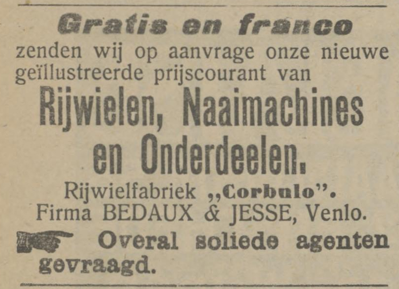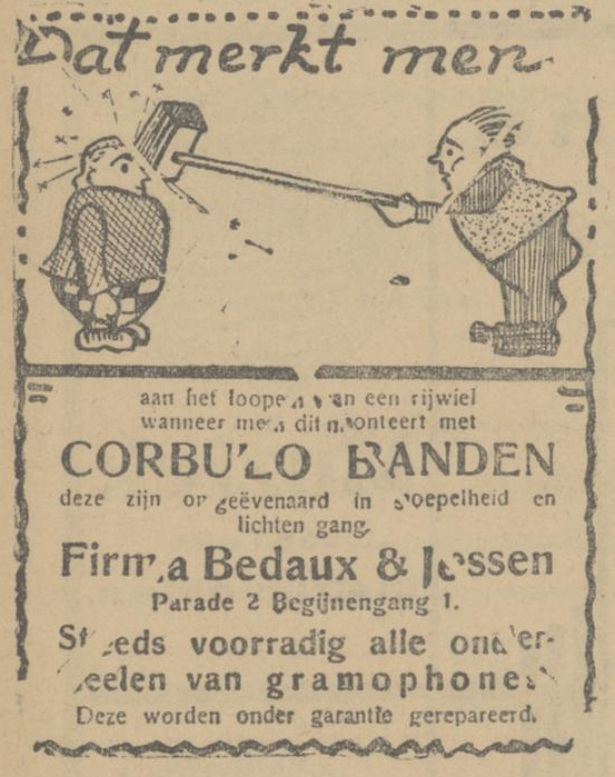 Als je vervolgens gaat zoeken op “Bedaux” en “Rijwielfabriek”, dan valt op dat er inderdaad een rijwielfabriek bestaan heeft met de naam “Rijwielfabriek Corbulo, Firma Bedaux & Jessen”, echter niet in de jaren ’50, maar in de jaren ’10 en ‘20. Deze was gevestigd aan de Parade 21 en verhuist in 1916 naar Parade 26. In 1924 wordt in een advertentie van de Firma Bedaux & Jessen als adres Parade 2 vermeld. Dit doet vermoeden dat het Dynast rijwiel een product was van de firma Bedaux. Van een echte fabriek zal geen sprake geweest zijn, hoogstens eigen assemblage.