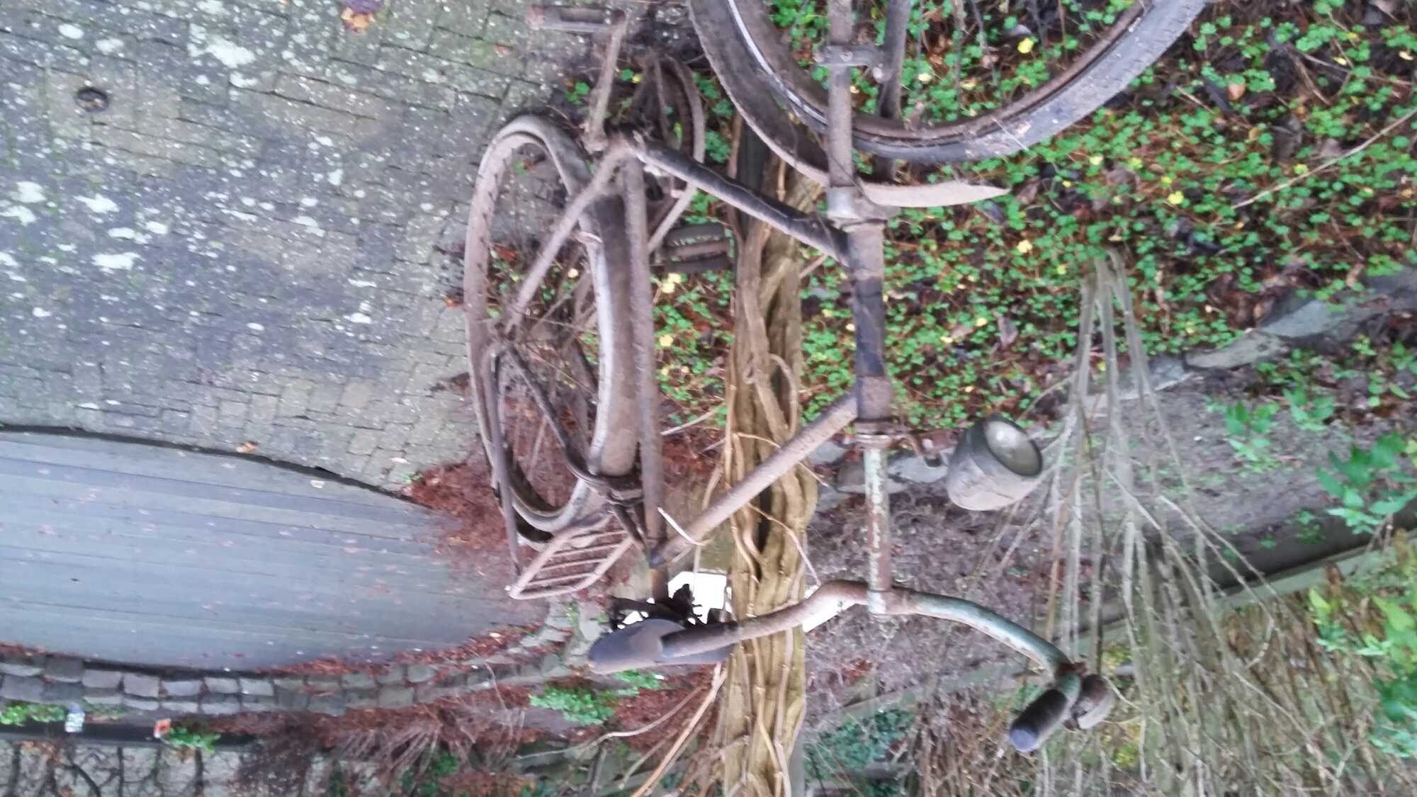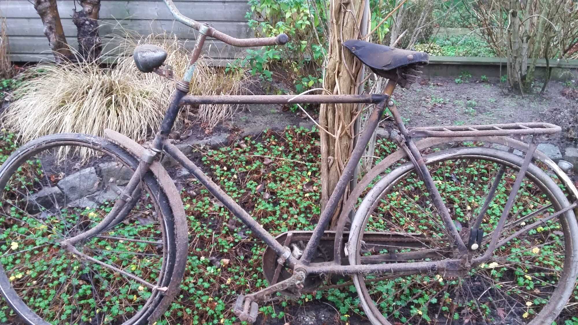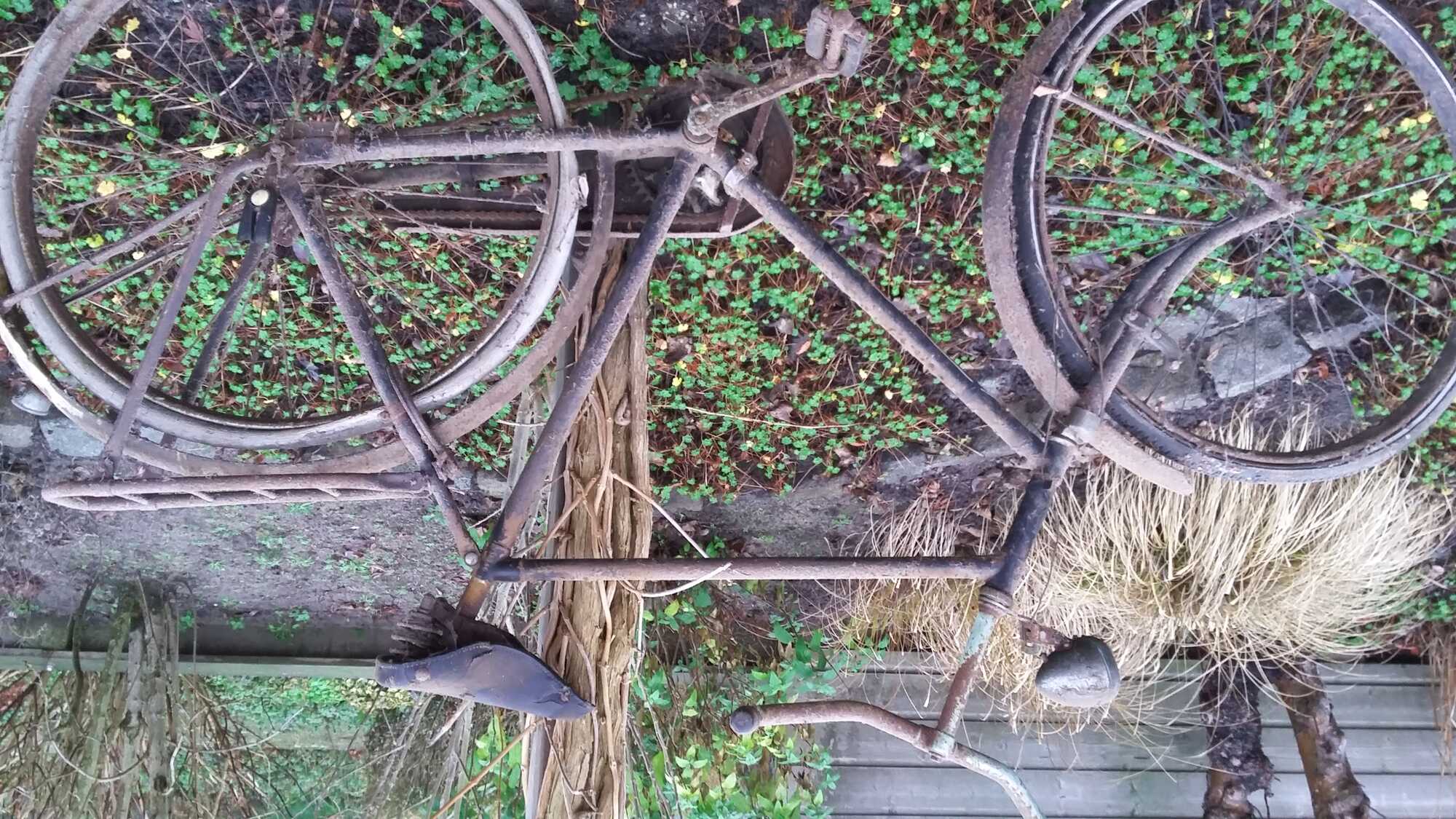 Het was de fiets van de vorige bewoner van het huis en aangezien de huidige bewoner er 40 jaar heeft gewoond, heeft de fiets minstens 40 jaar in het houthok gestaan - er zit trouwens wel een reflectieband voorop, die waren er toen nog niet ... De intentie om de fiets in zijn pensioneringstijd op te knappen heeft het nooit gehaald en nu de verhuizing aanstaande is, moest de fiets weg.