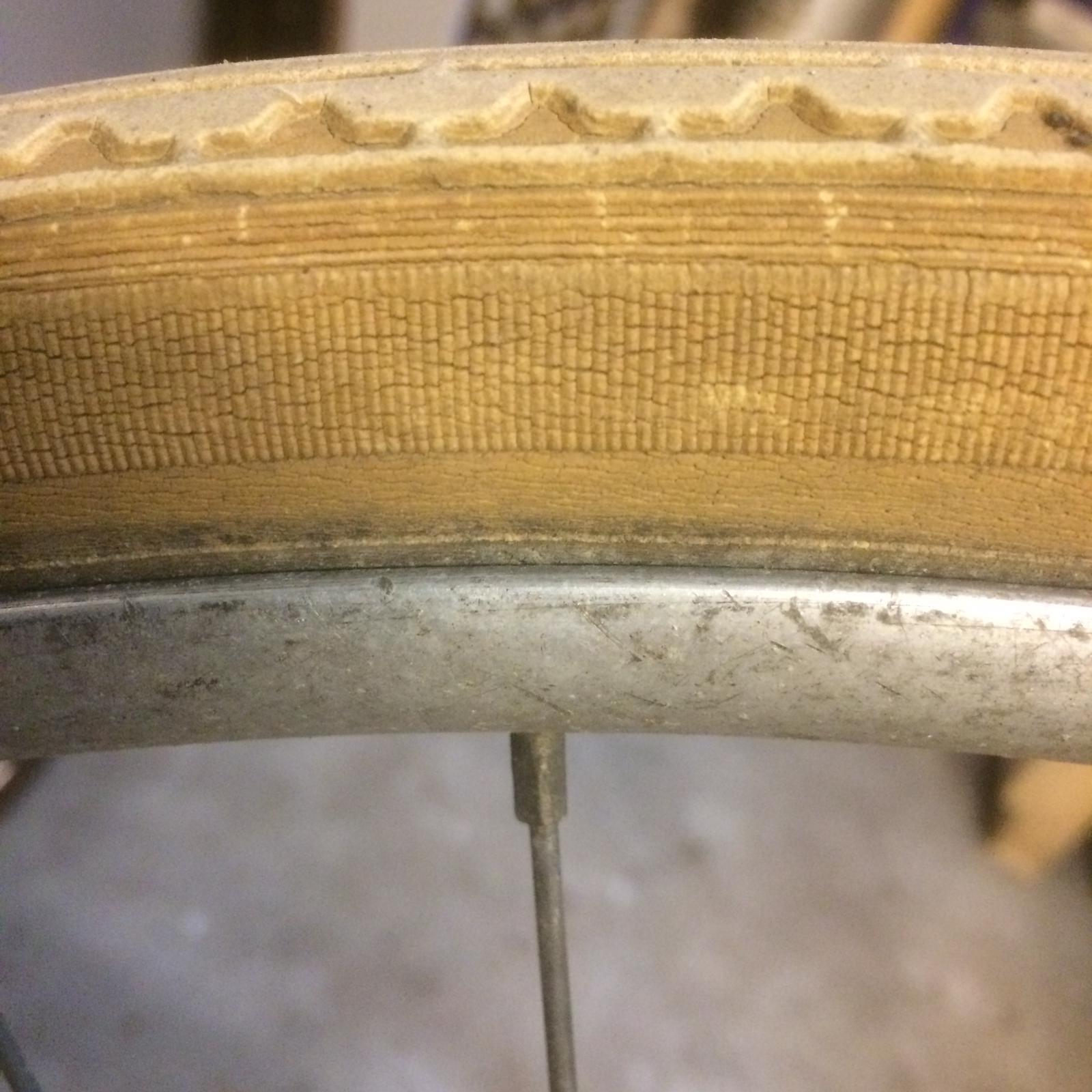 Het probleem is dat de banden (oude Vredestein) niet mooi gelijkmatig op de zelfde hoogte in de velg liggen, het gevolg is gehobbel tijdens het fietsen. Het hoogteverschil is zeker zo 8 a 10 mm.