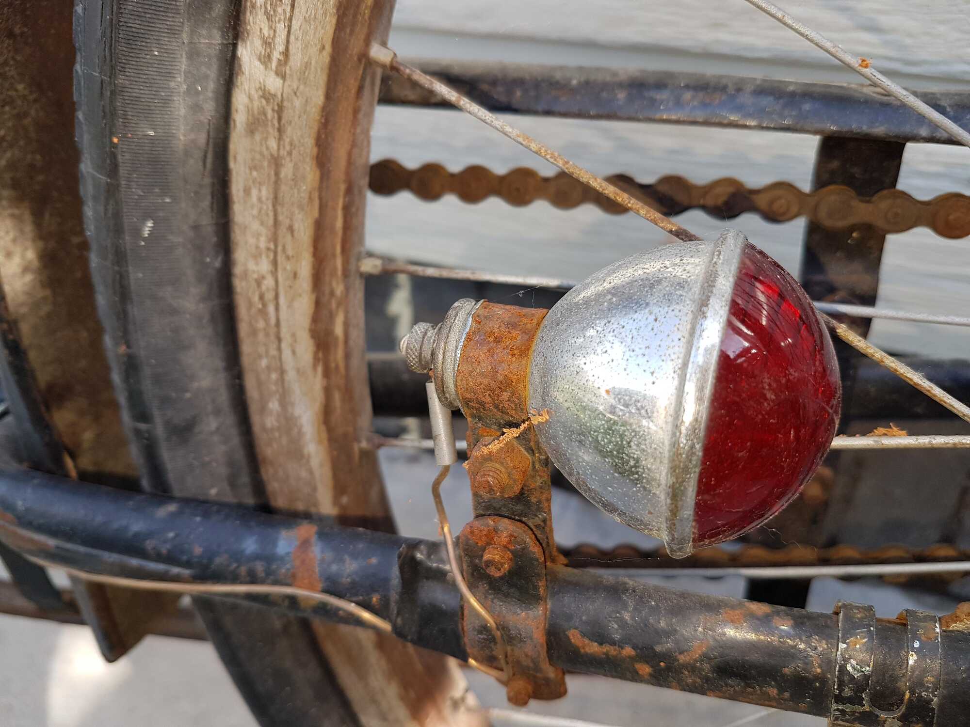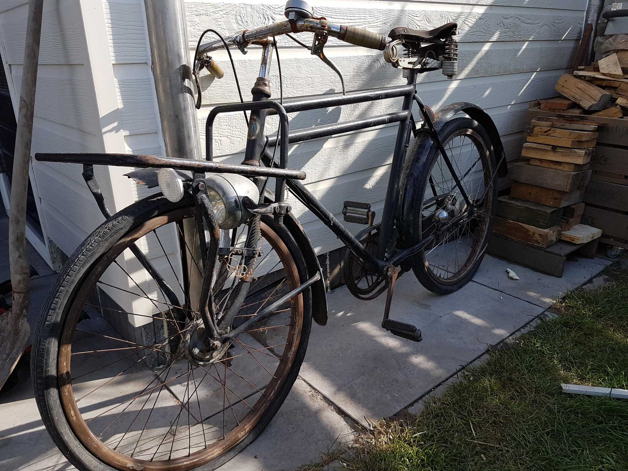 De fiets heeft houten velgen, trommelremmen, Bosch koplamp en achterlamp met flesdynamo