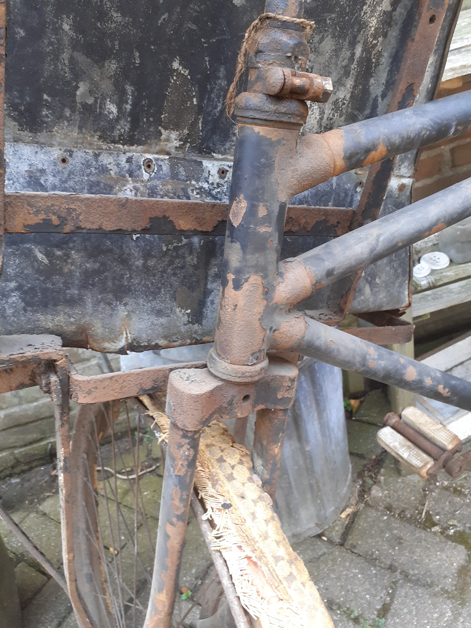 Deze is op fb al langs geweest . Nu de details . Komt uit Rotterdam Crooswijk. Heeft dus de bombardementen van Rotterdam overleefd ( niet schadeloos !) Ik ben samen met Colin op zoek gegaan naar het bewijs dat het een Juncker zou zijn . Op de achternaaf is nog niks te vinden, evenals op de voornaaf.Het balhoofd lijkt wel uit 1 stuk , dat kon ik nog niet ..Nog geen gaatjes gevonden van een balhoofdplaatje . Op de trapas een prachtige leeuw met kroon ! Op diverse onderdelen staat de M ingeslagen . Geen cijfer . Dit zijn de voorlopige bevindingen . Ik krijg volgende week ahgi een partij binnen met "goede" buitenbanden. Als ik die heb ga ik de naven demonteren, kortom , word vervolgd!