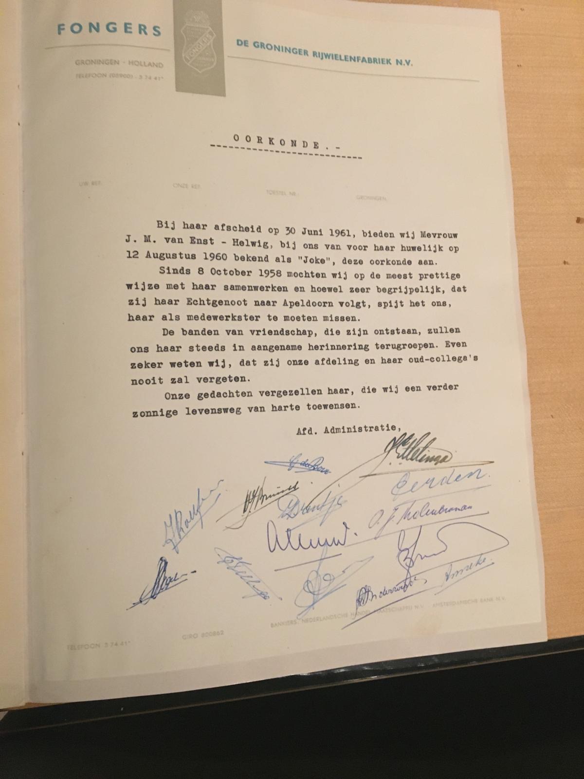 Buiten deze informatie ontving ik ook nog een '50 jaar Fongers' boekje waarin een oorkonde zat ter ere van Johanna haar afscheid bij Fongers.