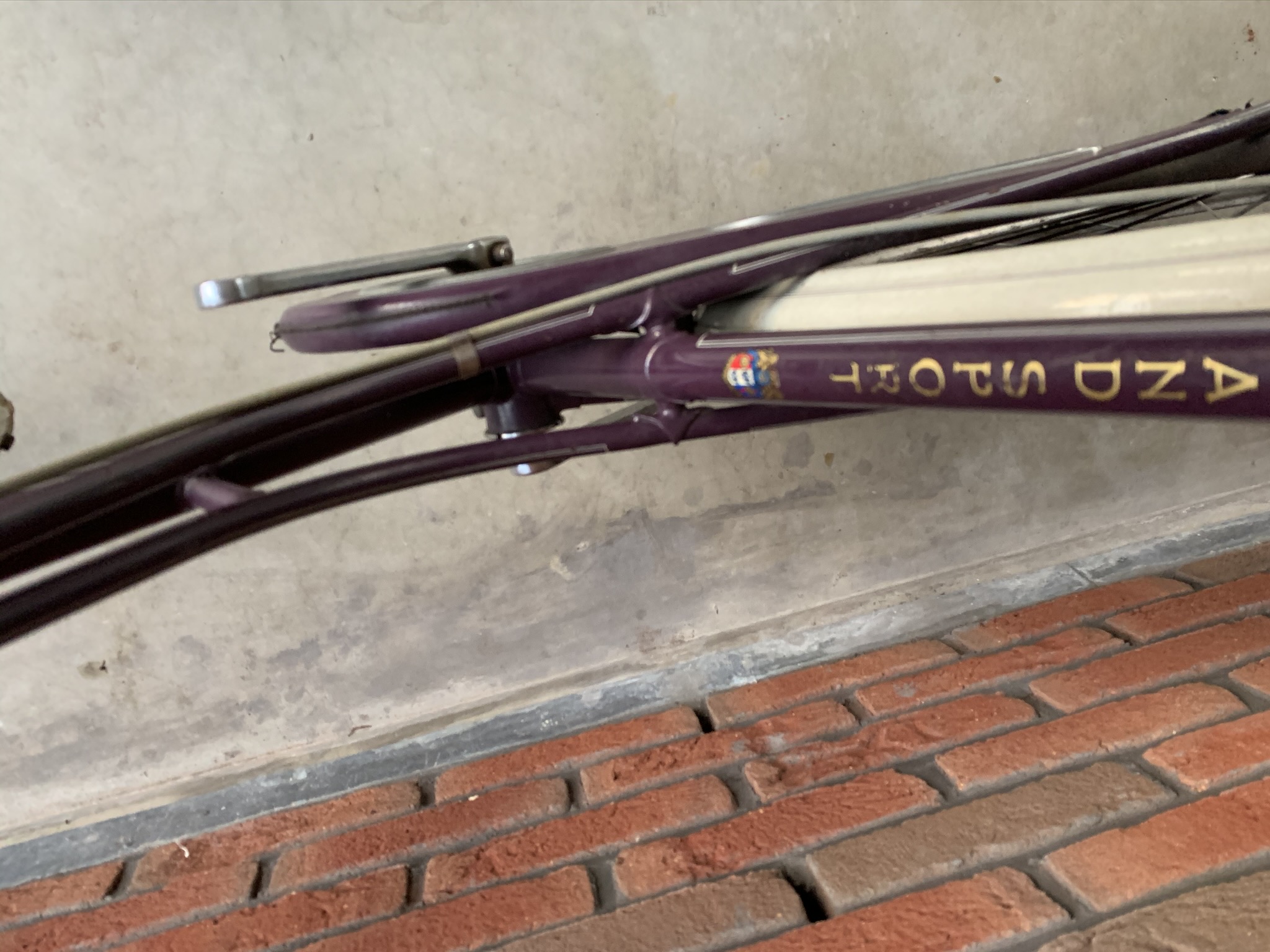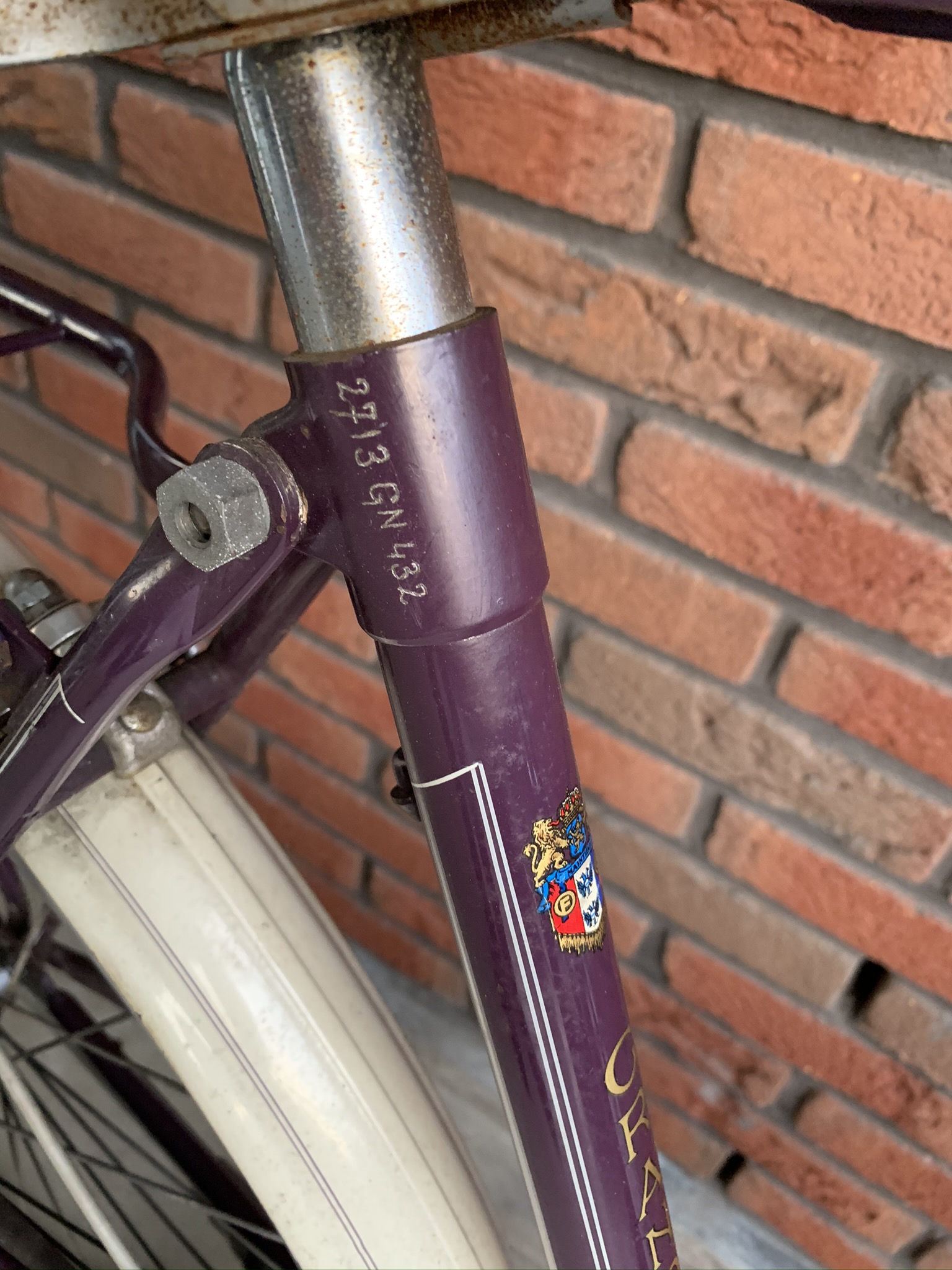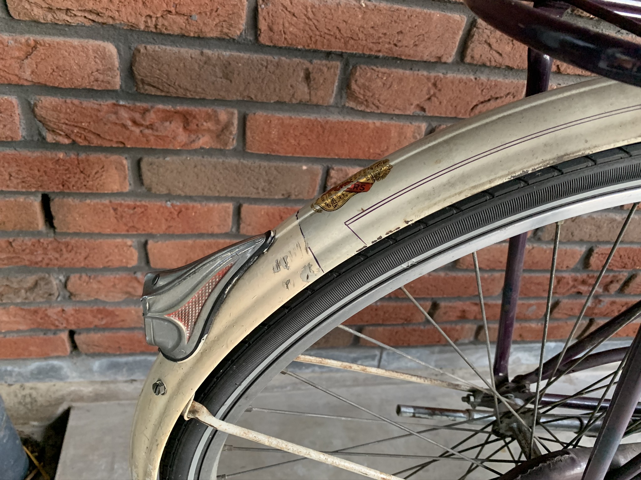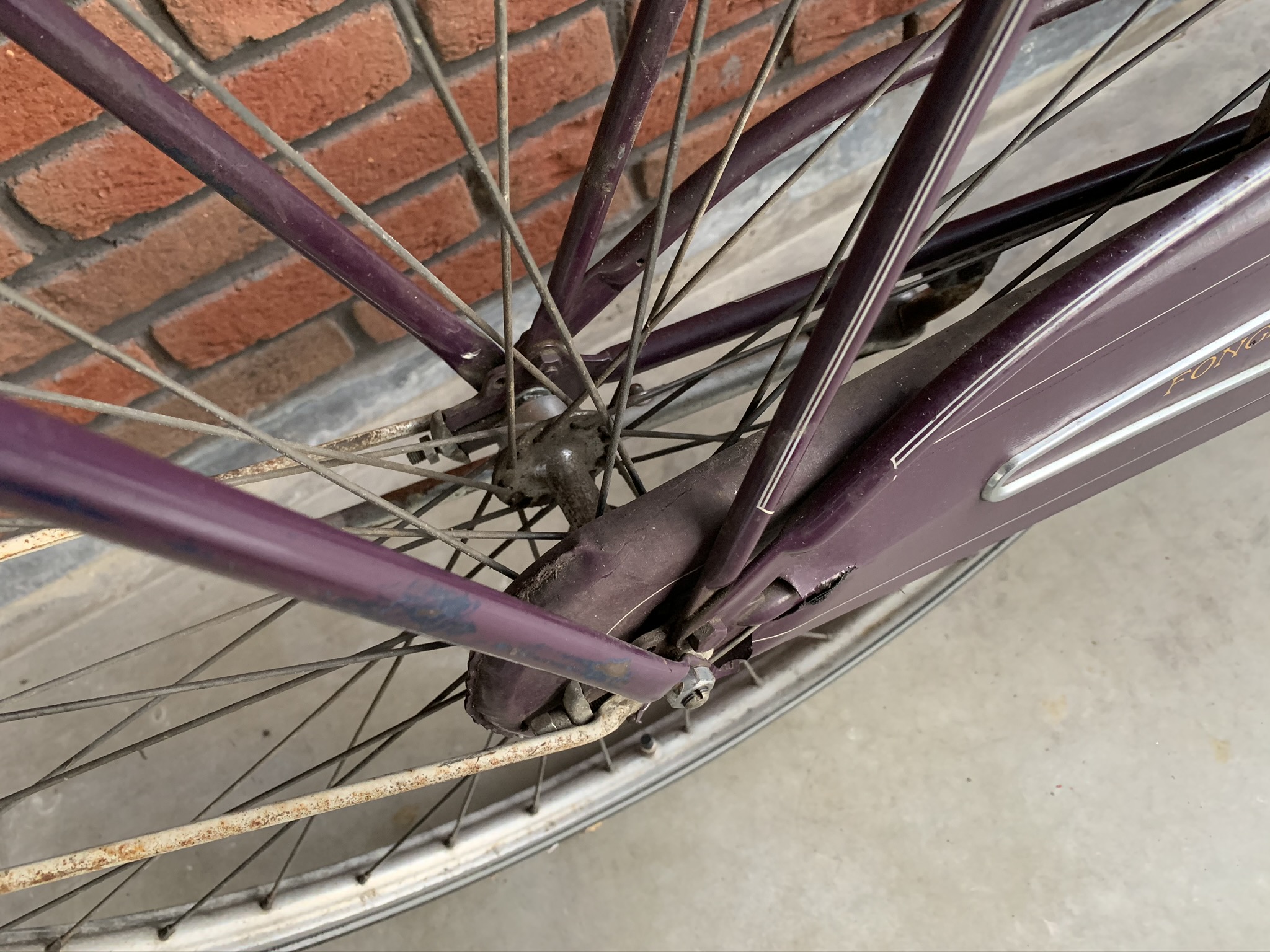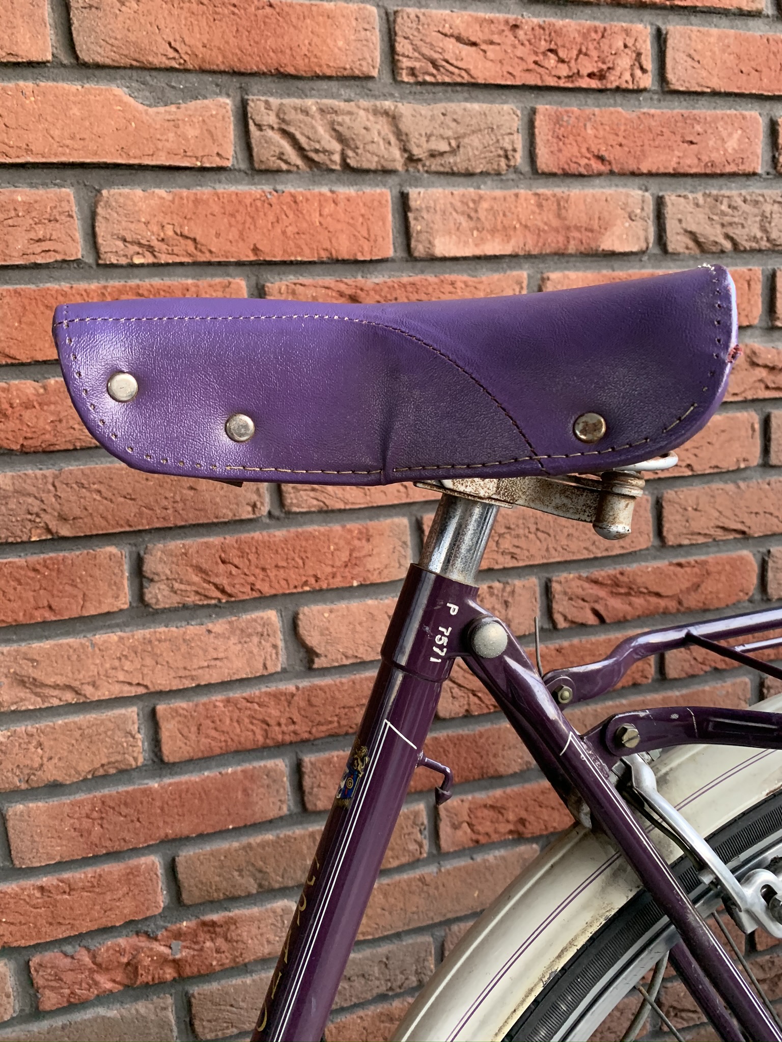 Het paarse frame lijkt haast wel nieuw en kent nauwelijks beschadigingen of roestplekjes. De spatborden en spatbordstangen wel iets meer.