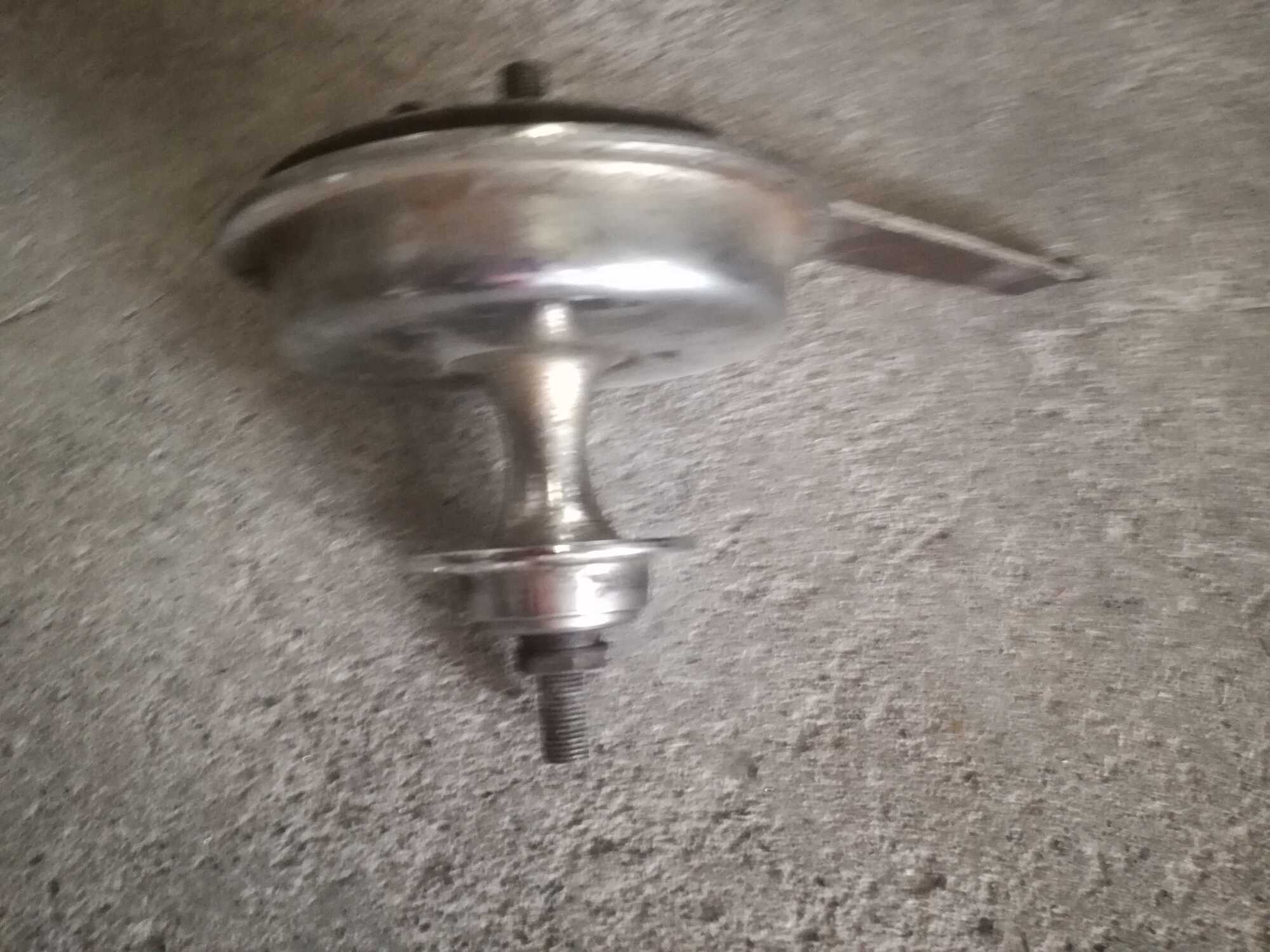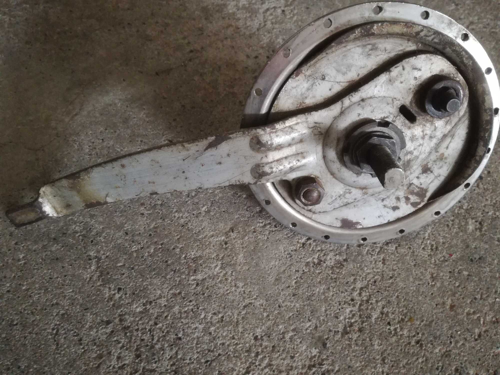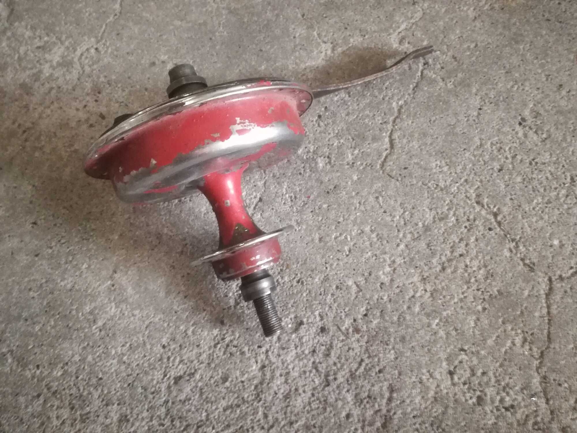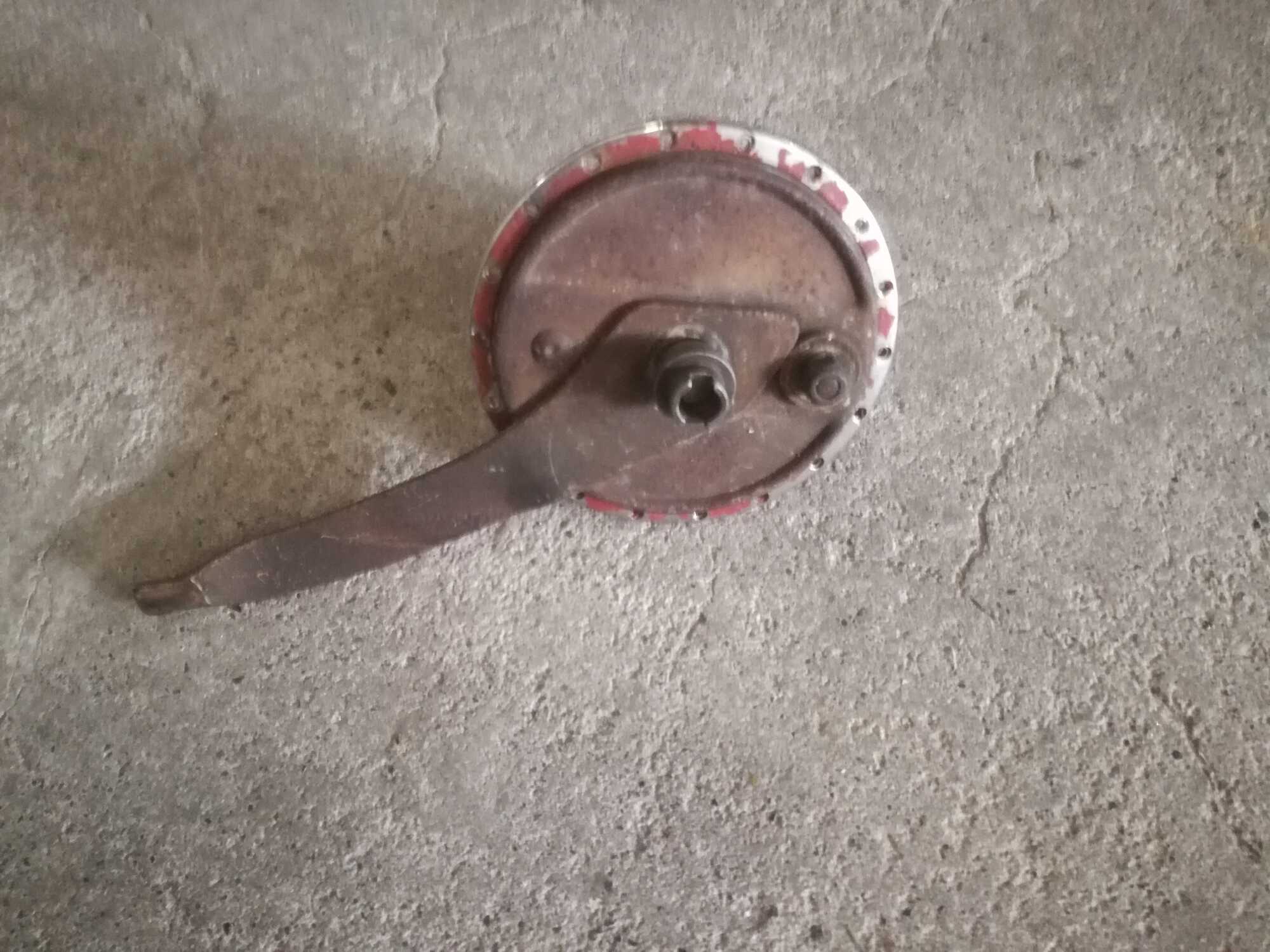 * trommelrem, diabolo (Gazelle?)-model met een platte zijde op de as, alleen naafhuis, as, ankerplaat en conussen;