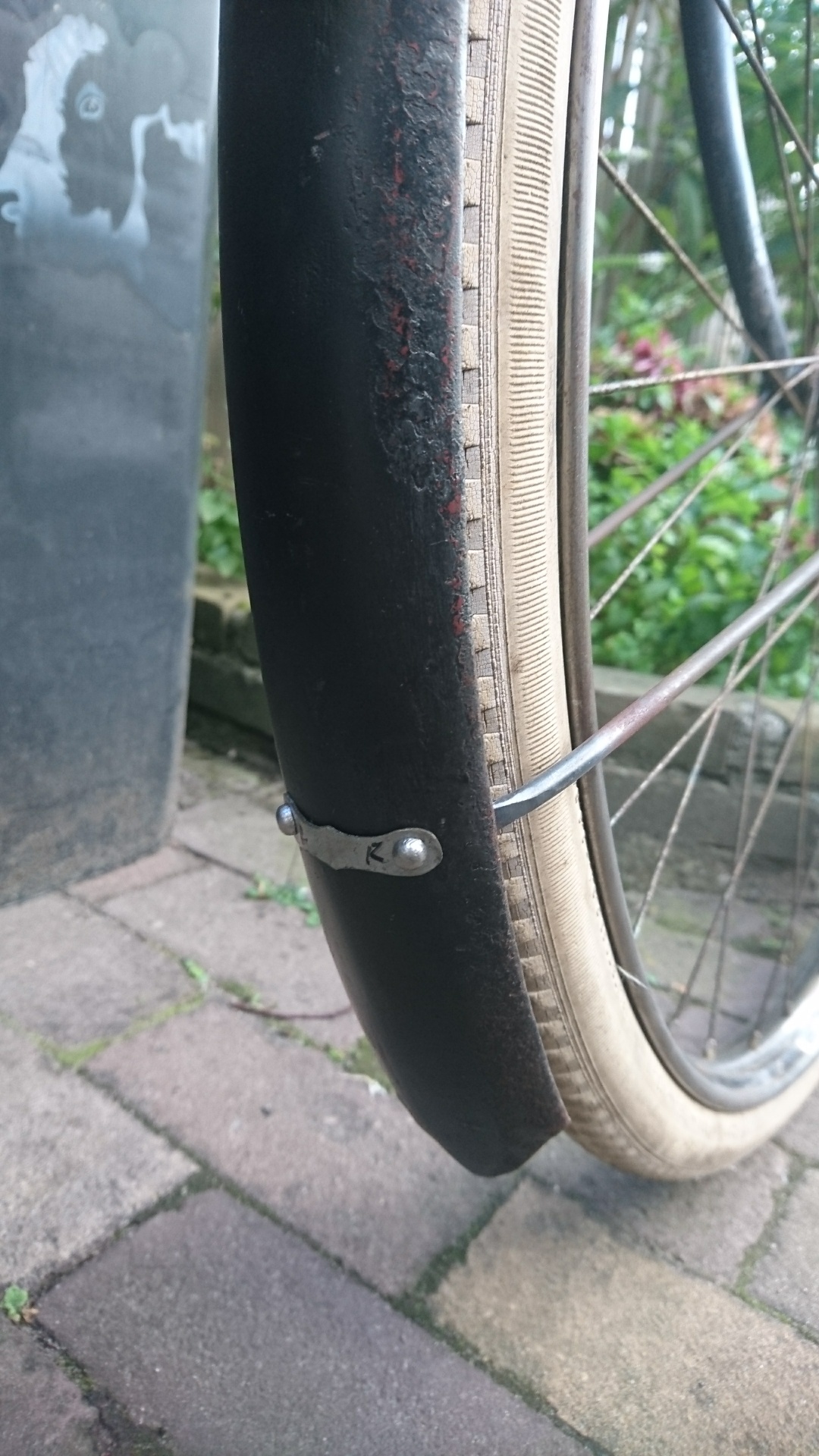 Ik zocht naar de kenmerkende hele smalle spatborden, maar vond ze niet. Uiteindelijk heb ik van de spatborden die mijn fiets had (breed model, Germaan oid) zelf smallere borden gemaakt. Dat was wel een uitdaging en leuk om te doen, gewoon om te kijken of ik zo goed kon lassen. Met de haakse slijper een centimeter er tussenuit gezaagd, en ze daarna over de hele lengte weer aan elkaar gelast. Het resultaat mag er wezen, en de roestrandjes zitten er al op.
