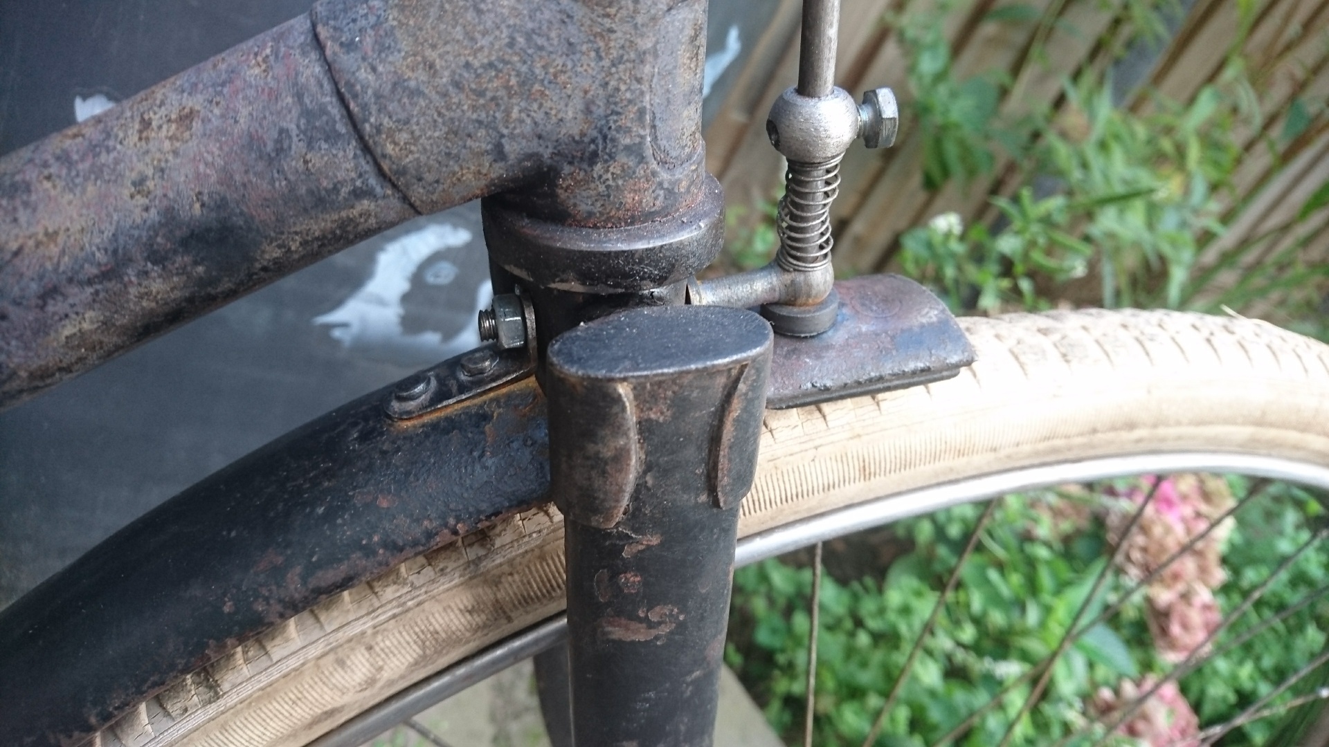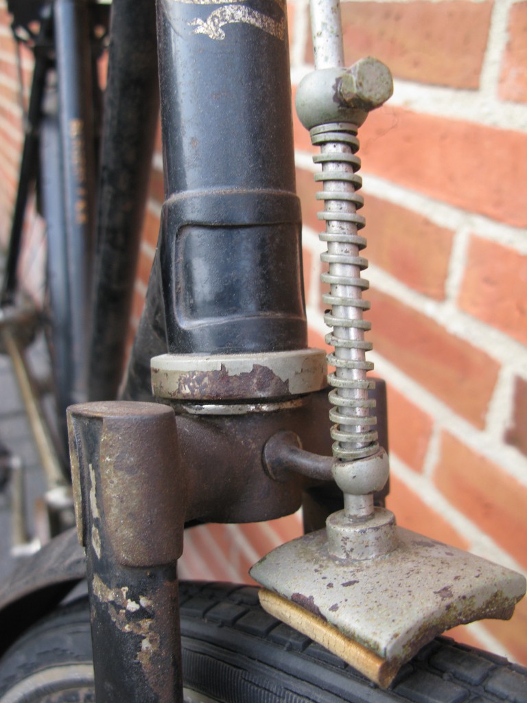 Daarmee dacht ik een heel eind te zijn. Want de niet-originele stempelrem die er op zat wilde ik wel behouden. Alleen het rare geleidebeugeltje op de voorvork zou ik graag vervangen door het sierlijke beugeltje van Burgers. Maar wat bleek: er paste helemaal geen remblok tussen de voorvork en de band. Ter vergelijking een foto van de Deventer-fiets: