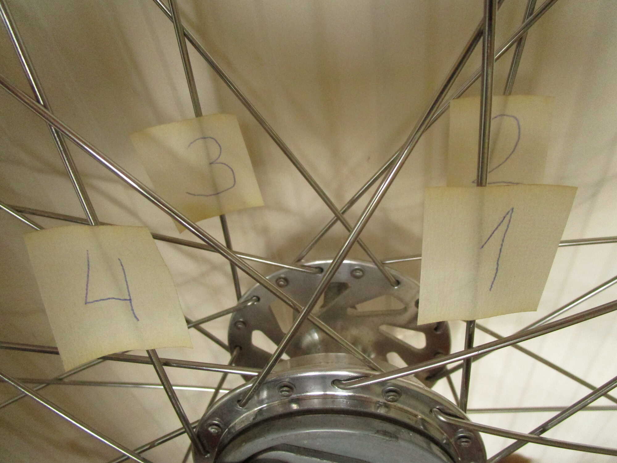 Bij transportfietsen werden de buitenste spaken geloof ik niet achter de laatst te kruisen spaak gehaald.