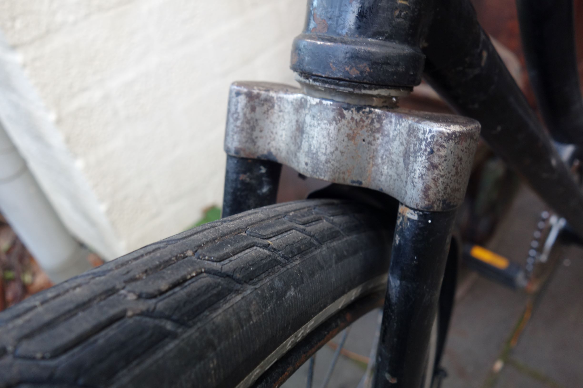 In feite zou ik de fiets nu met vast verzet kunnen opbouwen . Het is geen versie met bandrem geweest want de vork kroon is dicht aan de voorkant