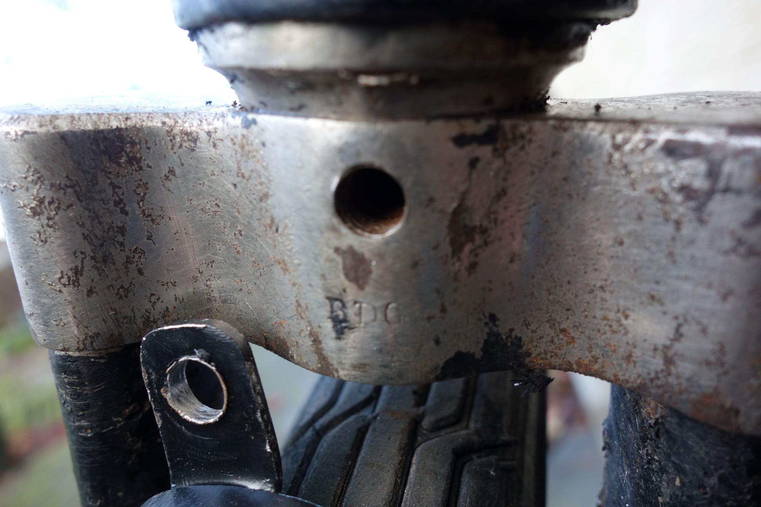 Op fotos van BDG`s zonder deze rem zie je twee schroefjes voor een overlappend beugeltje over de vork. Bij de BDG met omgekeerde remmen zit dat niet. De voorrem is van het zelfde model als ik al eens voor m`n BD3 heb gebouwd.