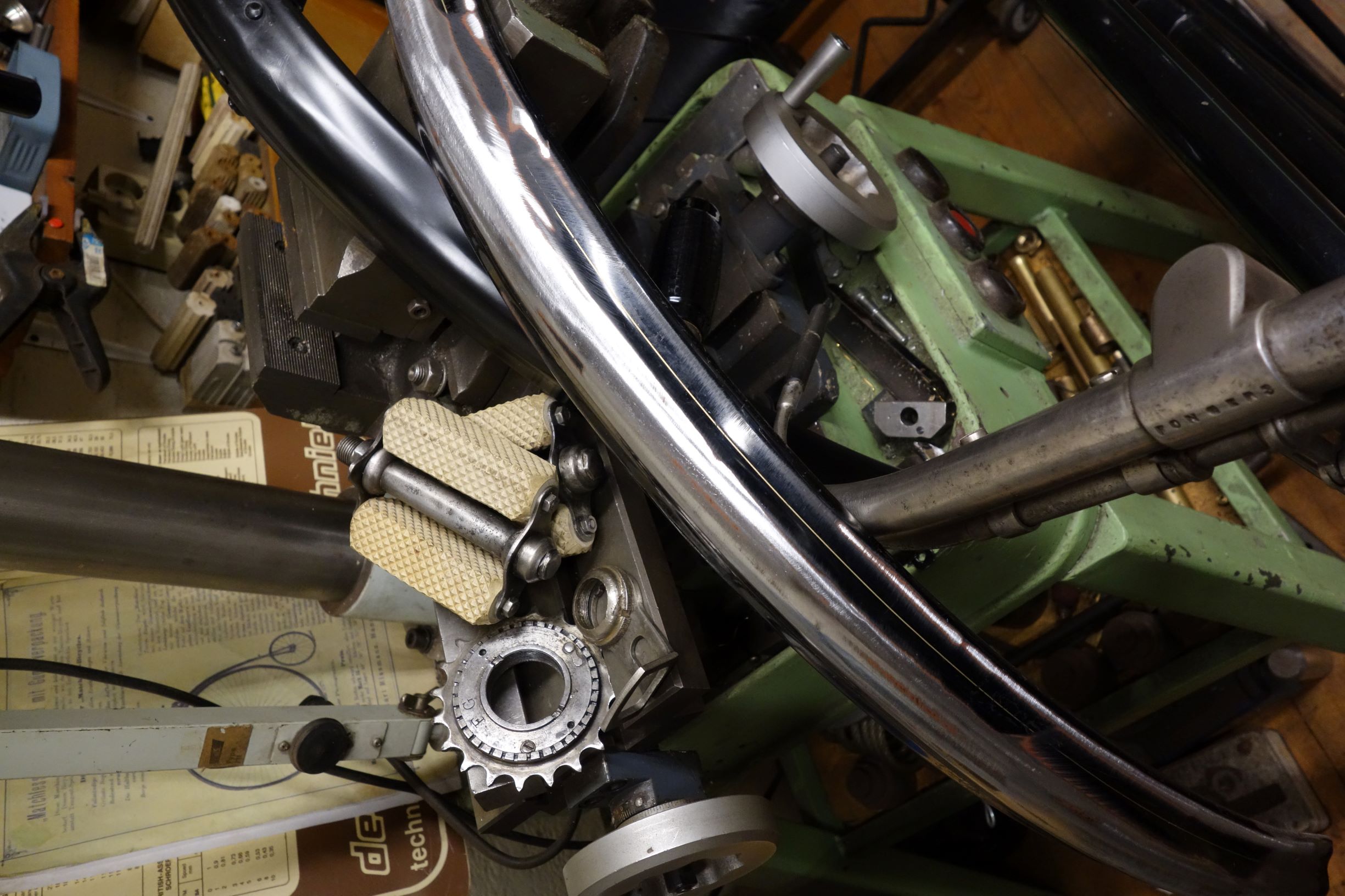 Bij deze Fongers zie je het ook aan de deksel aan tandwielzijde. Kleine kier tussen as en stofkap en dan zit het tandwiel daar ook weer vlak voor. Natuurlijk de kettingspanners weer nagebouwd van de foto`s. Je ziet op de Beeldbankfotos dat de spanner tussen liggende en staande vork zit en een beetje uitsteekt onder de vork vandaan. . Leukste experiment vandaag was het vervormen van een Fongers stuur uit 1928 zodat ze gaat lijken op een vroeg (1907 ) stuur.